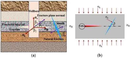 As shown in Figure 1, during fracturing, the fracturing fluid enters the fracture and generates a normal stress acting on the fracture walls. When the normal stress generated by the fracturing fluid is not less than the effective compressive stress borne by the formation, hydraulic fractures will cause tensile or shear failure along natural fractures. The normal stress acting on the fracture surface can be calculated by considering the orientation of the fracture relative to the in situ stress field. Let the approach angle of the natural fracture be β, then the normal stress acting on a fracture face of any orientation is [12,13,14]