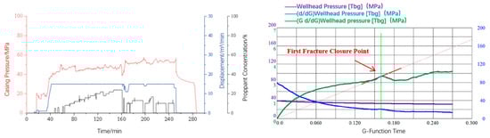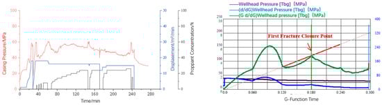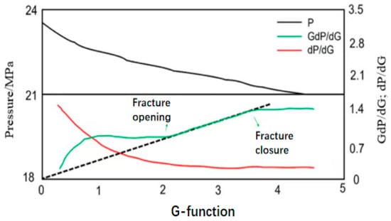 According to the formula, when the match pressure remains constant, parameters such as the fluid loss coefficient and proportionality coefficient remain unchanged for any given formation, indicating that the fluid state within the fracture is stable and the fracture is in the stage of gradual closure. Therefore, the relationship curve between the treating pressure p* and the G-function can be plotted (Figure 2). The interval where p* remains constant is the fracture closure interval, thus allowing the determination of the fracture closure point [16]. To identify the fracture closure point more accurately, a superposition derivative function GdP/dG is created to amplify the variation trend of the curve. When the horizontal segment in the dP/dG vs. G relationship curve is difficult to distinguish, it can be judged based on the approximate linear relationship in the GdP/dG vs. G plot.