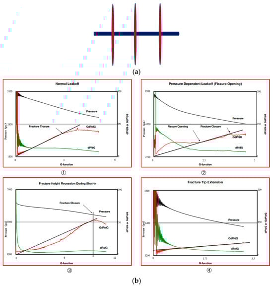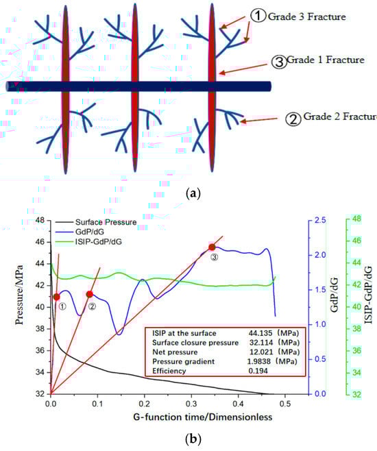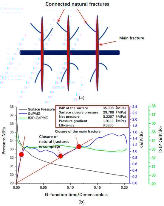 After pumping stops at the end of the field fracturing operation, fractures close sequentially according to their width and net pressure, from smallest to largest; the main hydraulic fracture closes last (Figure 4). By drawing the G-function superposition derivative curve intersecting the origin, the closure points of both the natural fractures and the main hydraulic fracture can be obtained.