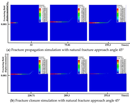To study the relationship between closure pressure and in situ stress for simple natural fractures with different approach angles, numerical simulations were conducted on models with natural fractures interacting with hydraulic fractures at approach angles of 30°, 45°, 60°, and 75°. The simulation results are shown in Figure 7, Figure 8, Figure 9 and Figure 10. The results indicate that when the natural fracture approach angle is 30°, a smaller approach angle results in lower shear stress at the intersection of the hydraulic and natural fractures, reducing the resistance to fracture propagation. The hydraulic fracture tends to propagate along the natural fracture, forming a larger communication area. As the natural fracture approach angle gradually increases, the increased shear stress between fractures causes the hydraulic fracture to tend to penetrate the natural fracture rather than propagate along it, thus reducing the scale of fracture communication. Simulation results of the shut-in unloading process show that natural fractures close before the hydraulic fracture, and the smaller the scale of the natural fracture, the shorter the closure time. This is because smaller-scale natural fractures have higher closure pressures, causing them to close earlier after shut-in. Simultaneously, as the approach angle increases, the scale of activated natural fractures decreases, and the required closure time also shortens accordingly.