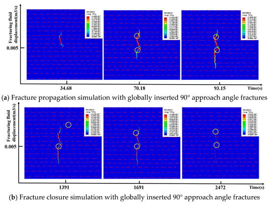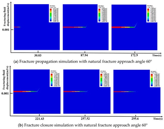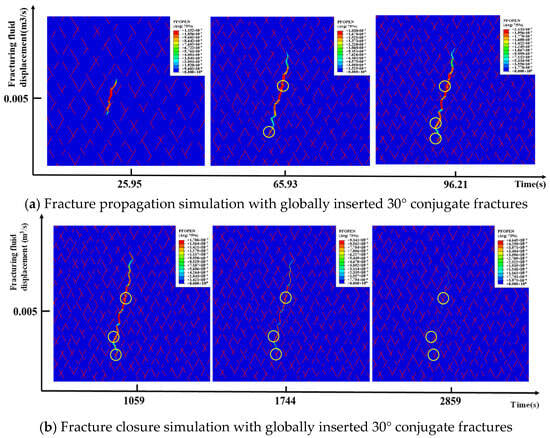 To study the relationship between closure pressure and in situ stress for moderately complex fractures under different approach angles, numerical models with globally inserted conjugate natural fractures at approach angles of 30° (Figure 12), 60° (Figure 13), and 90° (Figure 14) were established for simulation [22]. The results show that as the approach angle increases, the geometric morphology of the natural fractures and the propagation path of the hydraulic fracture change. At an approach angle of 30°, the hydraulic fracture can propagate relatively smoothly along the extension direction of the natural fractures, resulting in a longer closure time for the natural fractures. At an approach angle of 90°, the propagation direction of the hydraulic fracture is more perpendicular to the natural fractures, restricting hydraulic fracture propagation, and the natural fractures close more quickly.