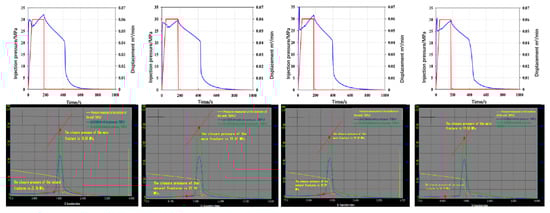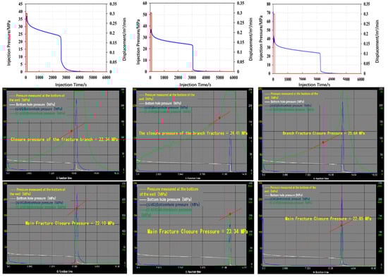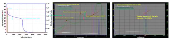 Based on the numerical simulation results from the previous section, whether for simple, moderately complex, or complex natural fractures, when the approach angle is greater than 60°, the closure pressure at the first fracture closure point after shut-in in the deep coal seam fracture network fracturing approximates the maximum horizontal principal stress. Based on this conclusion, the surface first closure pressure is picked from the fracturing shut-in data. This surface first closure pressure is converted to the bottomhole closure pressure, which is the maximum horizontal principal stress. Furthermore, the minimum horizontal principal stress can be obtained through formula conversion based on the maximum horizontal principal stress.