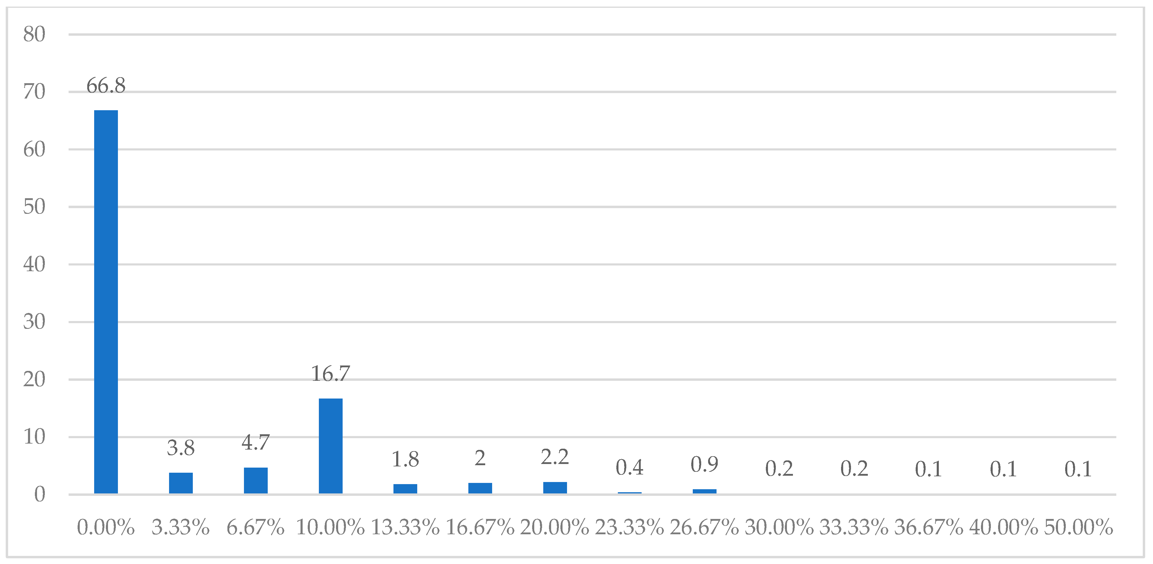 The largest share of respondents (66.8%) indicated zero willingness to pay more for environmentally friendly energy, selecting 0% as their preferred option. The second most frequent response was 10%, chosen by 16.7% of participants. In total, 31.2% of the sample expressed some willingness to pay a premium, up to a maximum of 20% above the cost of conventional energy. Beyond this threshold, responses decline sharply: only about 2% of respondents were willing to pay more than 20% extra.