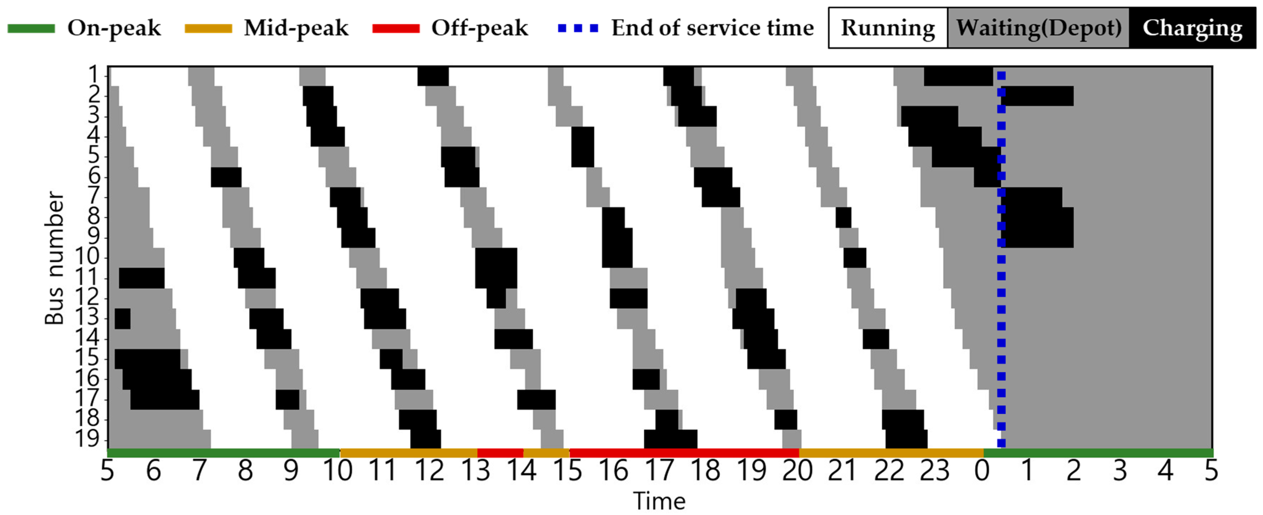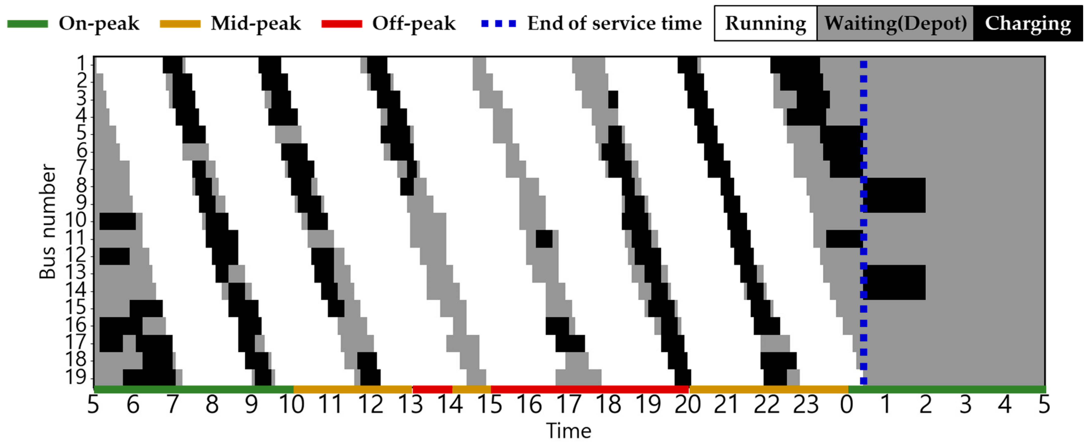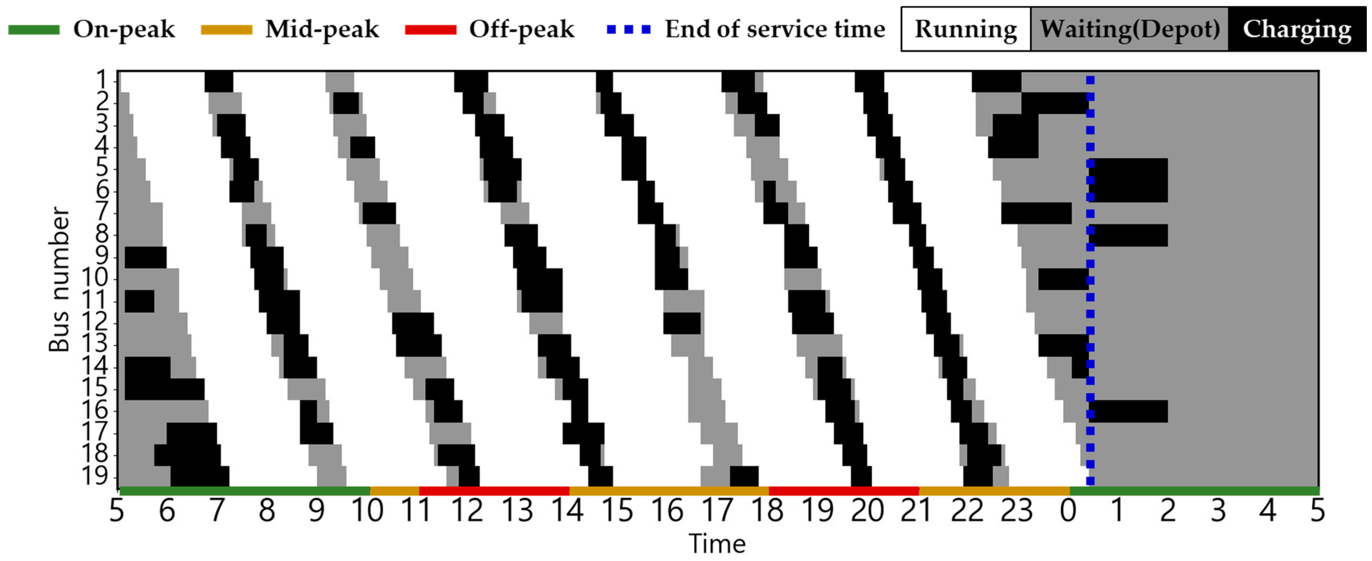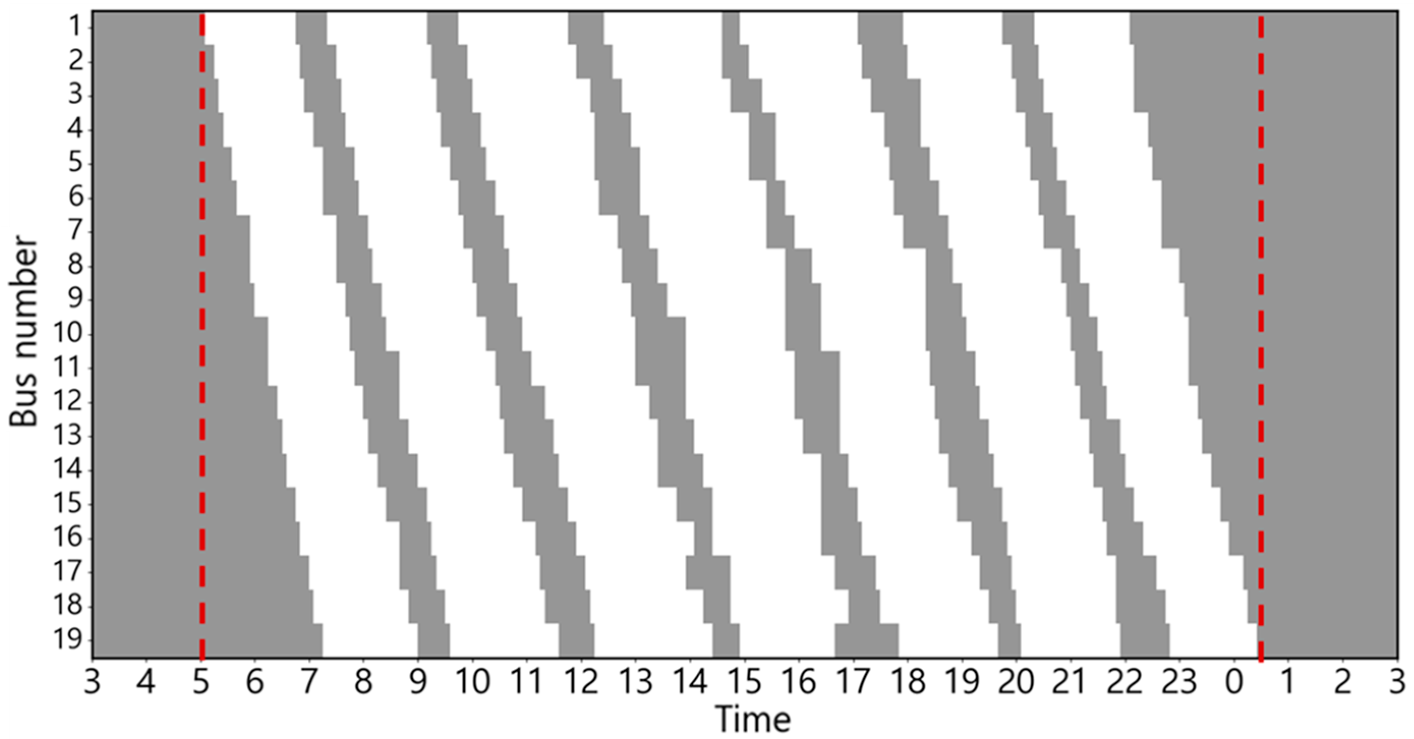 The EB routes employed in this case study correspond to city buses operating in Busan, South Korea. The electricity usage rate is equivalent to the electric vehicle charging cost (for charging service providers) in South Korea, based on [30]. This can be confirmed in Figure 2. The changes in charging cost by season and load hours are displayed from 5:00 a.m. to 5:00 a.m. the following day based on the route’s dispatch schedule. The ambient air temperature used to estimate the heating and cooling energy consumptions is the ambient air temperature of Busan, which serves as the operational area for EBs [31]. The route distance of the target EB is 32.9 km, and there are a total of 19 EBs operating on weekdays, with the first EB departure time and last EB return time set at 5:00 a.m. and 12:30 a.m., respectively [32,33]. Figure 3 shows the weekday operating patterns of the target EB. The depot waiting state (gray), running state (white), and red dotted lines indicating the departure time of the first EB and return time of the last EB [34] are shown.