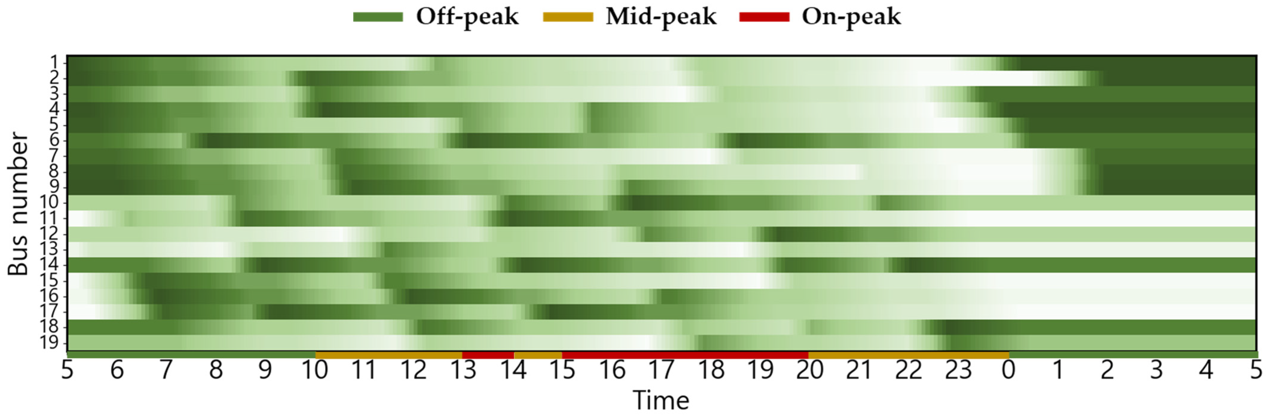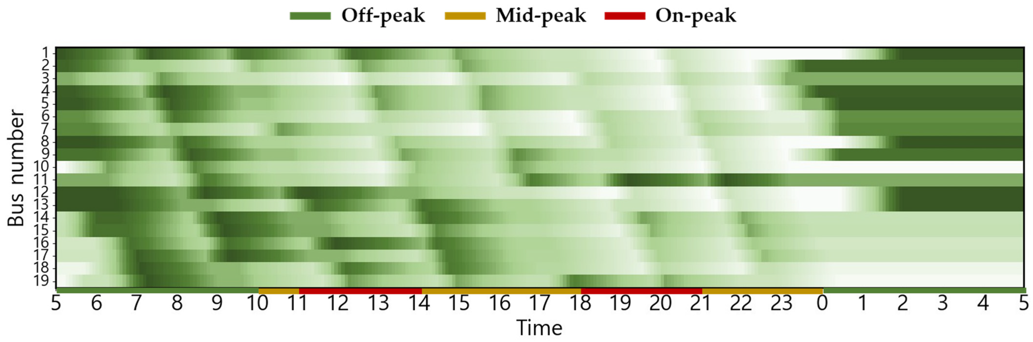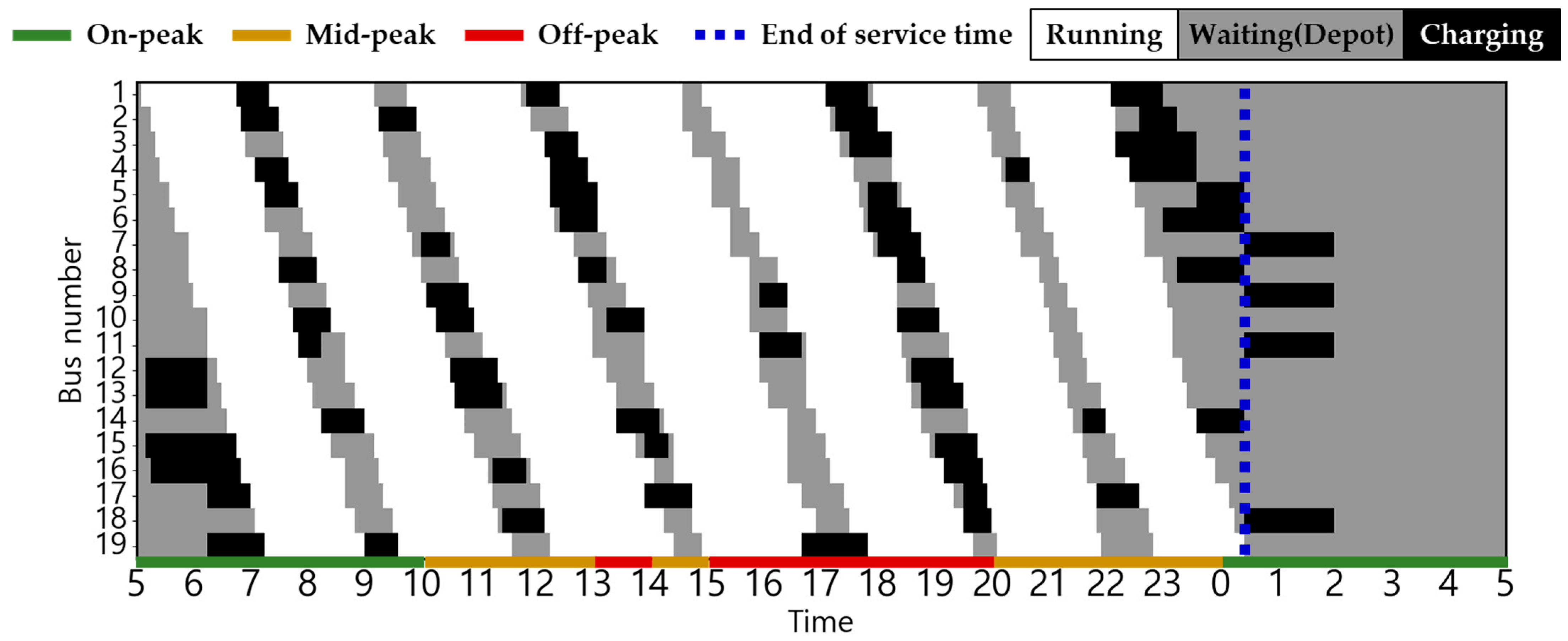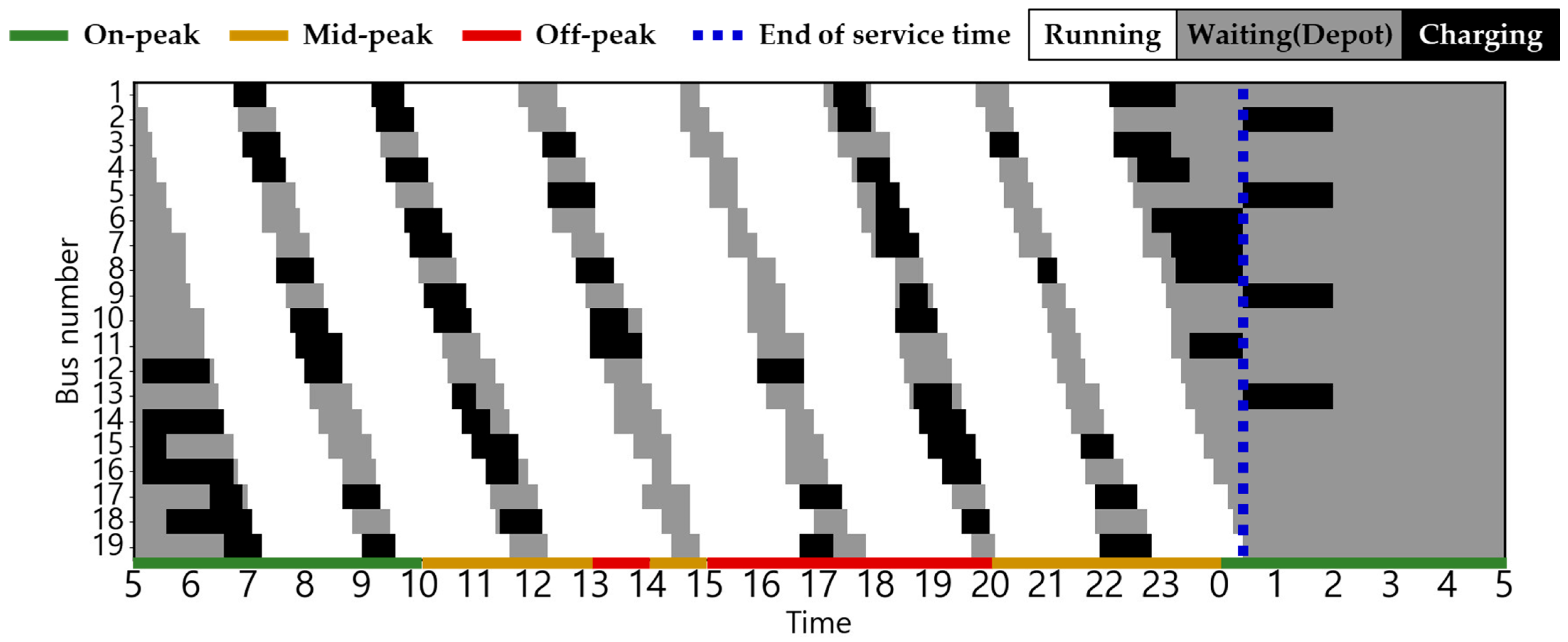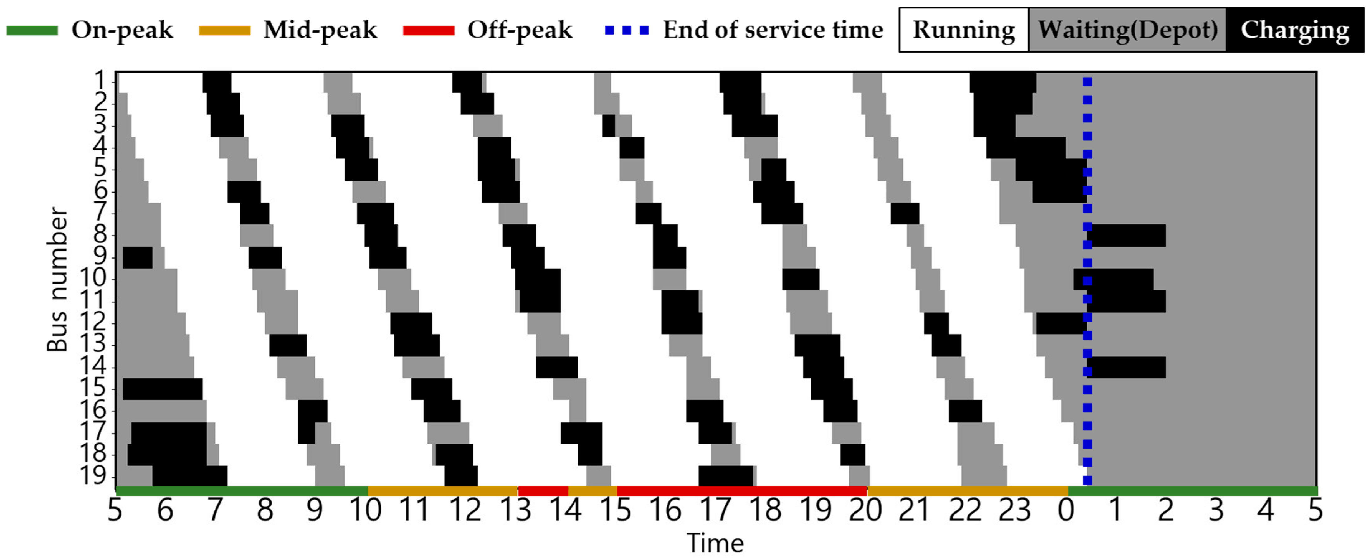 The EB routes employed in this case study correspond to city buses operating in Busan, South Korea. The electricity usage rate is equivalent to the electric vehicle charging cost (for charging service providers) in South Korea, based on [30]. This can be confirmed in Figure 2. The changes in charging cost by season and load hours are displayed from 5:00 a.m. to 5:00 a.m. the following day based on the route’s dispatch schedule. The ambient air temperature used to estimate the heating and cooling energy consumptions is the ambient air temperature of Busan, which serves as the operational area for EBs [31]. The route distance of the target EB is 32.9 km, and there are a total of 19 EBs operating on weekdays, with the first EB departure time and last EB return time set at 5:00 a.m. and 12:30 a.m., respectively [32,33]. Figure 3 shows the weekday operating patterns of the target EB. The depot waiting state (gray), running state (white), and red dotted lines indicating the departure time of the first EB and return time of the last EB [34] are shown.