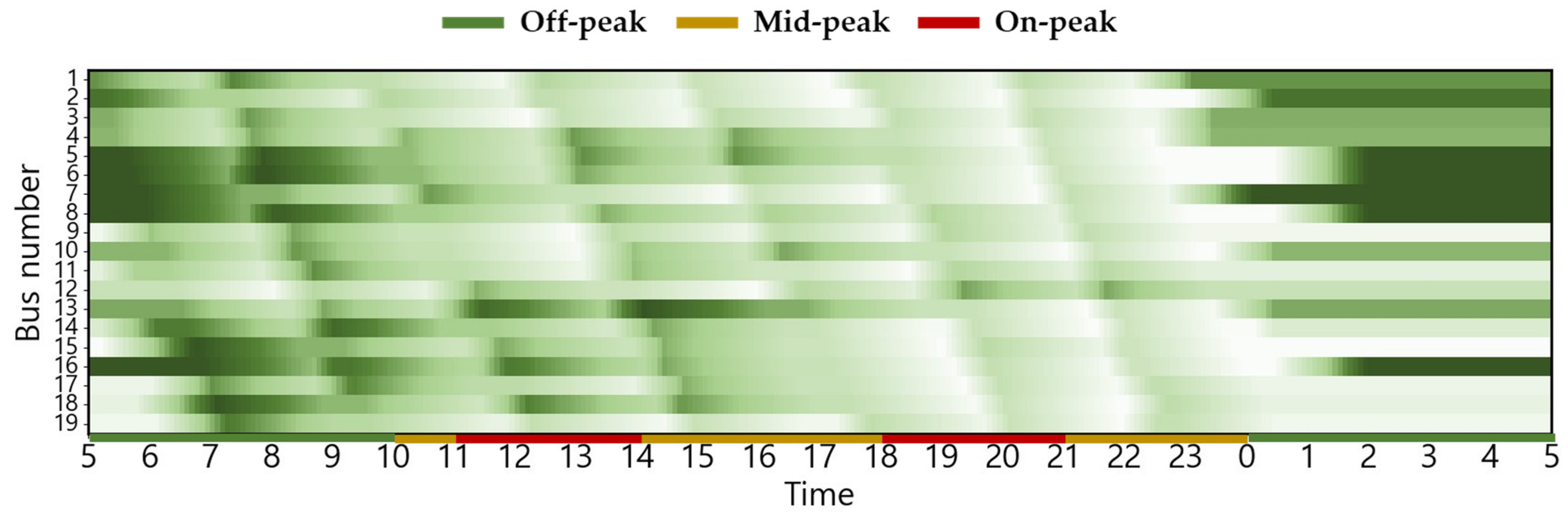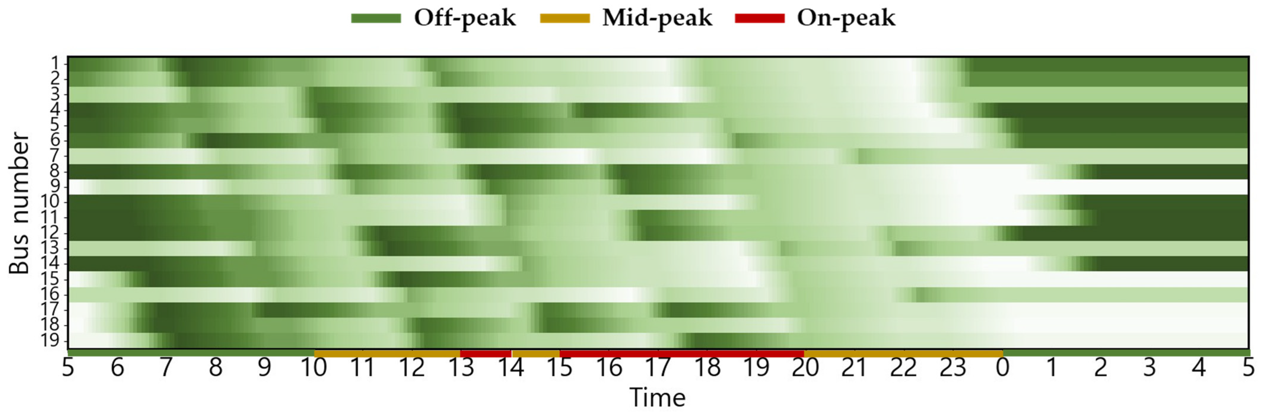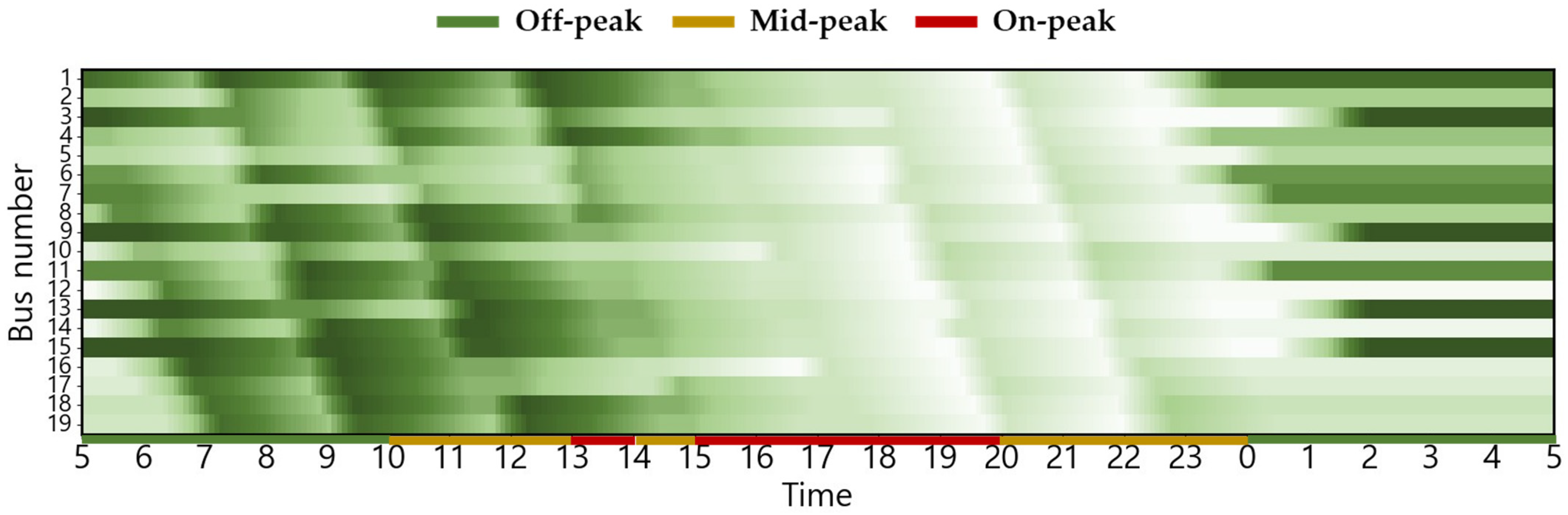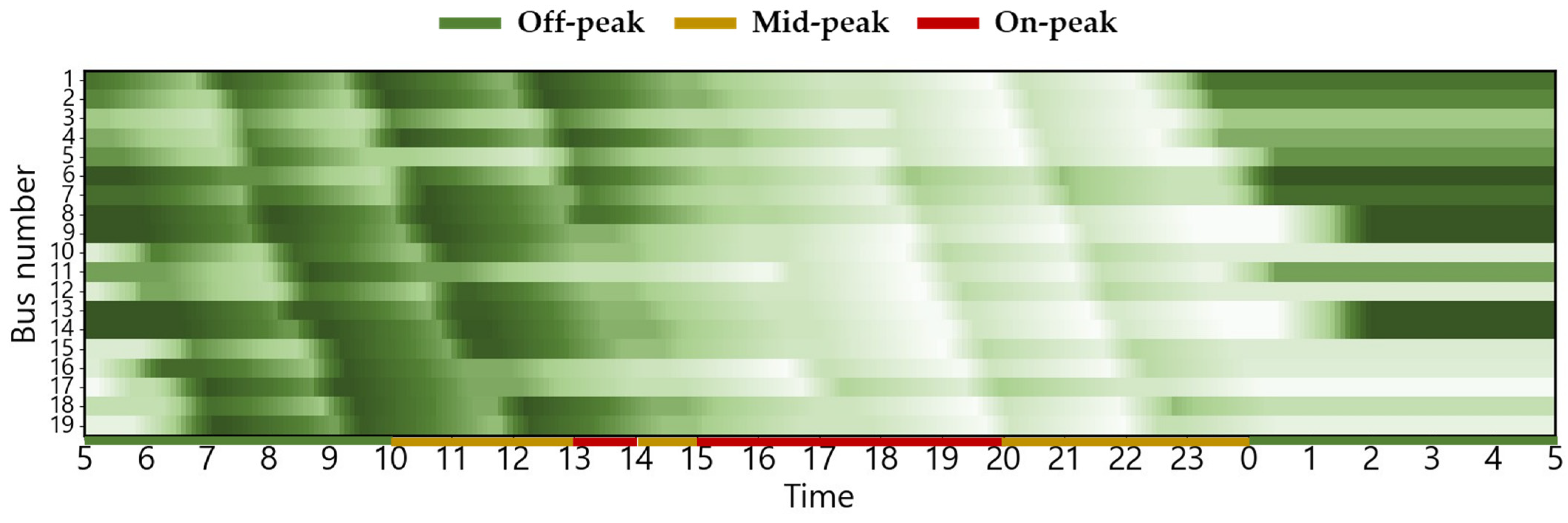 The EB routes employed in this case study correspond to city buses operating in Busan, South Korea. The electricity usage rate is equivalent to the electric vehicle charging cost (for charging service providers) in South Korea, based on [30]. This can be confirmed in Figure 2. The changes in charging cost by season and load hours are displayed from 5:00 a.m. to 5:00 a.m. the following day based on the route’s dispatch schedule. The ambient air temperature used to estimate the heating and cooling energy consumptions is the ambient air temperature of Busan, which serves as the operational area for EBs [31]. The route distance of the target EB is 32.9 km, and there are a total of 19 EBs operating on weekdays, with the first EB departure time and last EB return time set at 5:00 a.m. and 12:30 a.m., respectively [32,33]. Figure 3 shows the weekday operating patterns of the target EB. The depot waiting state (gray), running state (white), and red dotted lines indicating the departure time of the first EB and return time of the last EB [34] are shown.