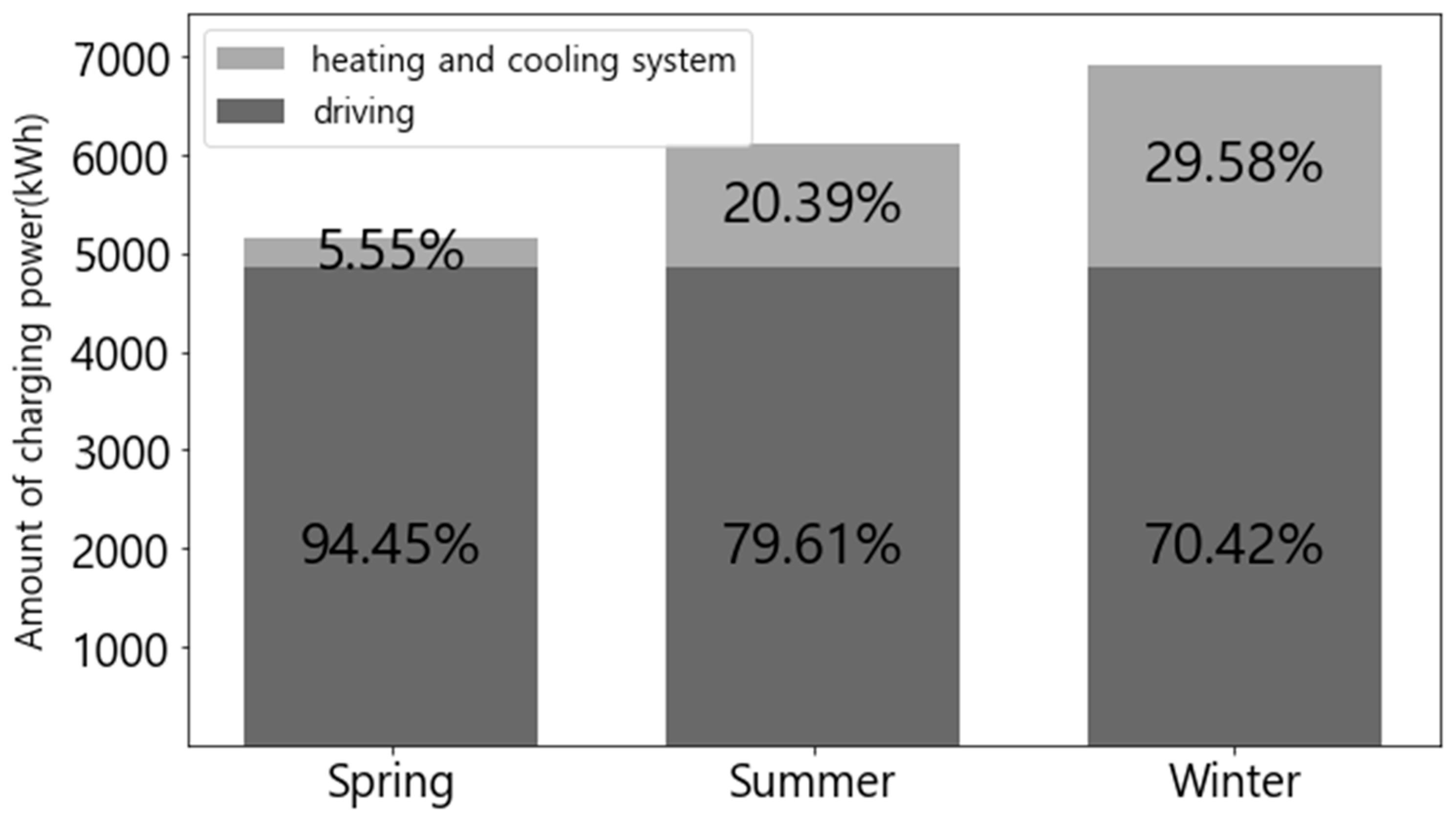 Figure 5. Comparison of energy consumption by season. (The percentage written on each bar represents the ratio of the energy consumption due to the heating and cooling system and driving to the total energy consumption.).