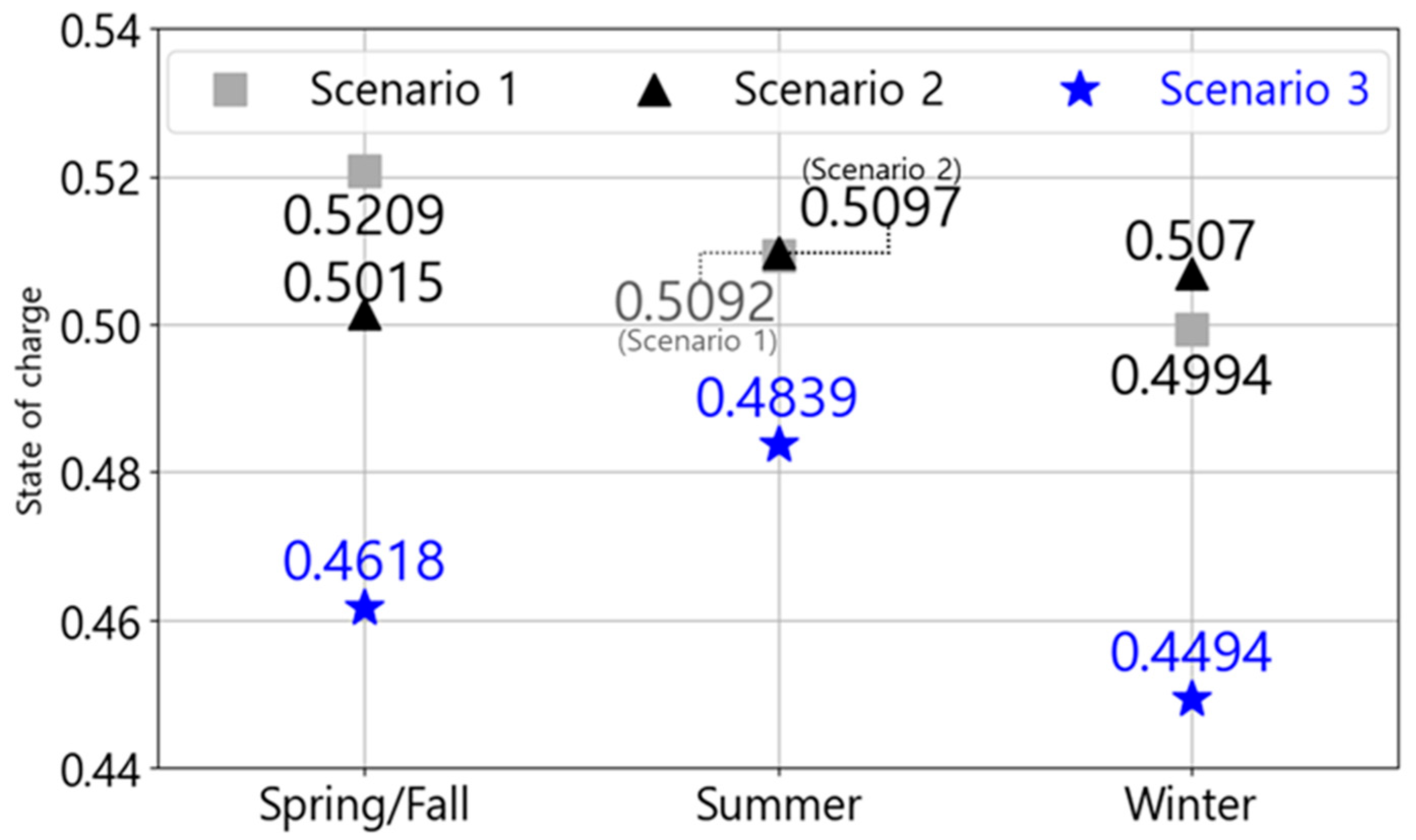 Figure 15 shows the average battery SoC of EBs for each scenario and season. The average battery SoC for Scenario 3, which considered battery degradation, remained lower than that for Scenarios 1 and 2 for all seasons. This is because the battery SoC of EBs is affected by calendar aging. Although the dispatch schedule was the same for all seasons and scenarios, the energy consumptions per season differed. Consequently, the average battery SoC in Scenario 1, which did not consider the TOU charging cost, decreased in the order of spring/fall, summer, and winter. It was confirmed that the operating schedule of all seasons is the same, but it is inversely proportional accordingly because the energy consumption of each season is different. However, in Scenarios 2 and 3, where the TOU charging costs were considered, the average battery SoC decreased in the order of summer, winter, and spring/fall. The reason for the lowest value in winter is because energy consumption is highest. In addition, the average battery SoC is highest during summer, likely due to charging schedule adjustments to avoid peak load hours. This is due to the fact that the peak load rate during the summer season is the highest, although the total peak load hours for all seasons remain constant at six h.