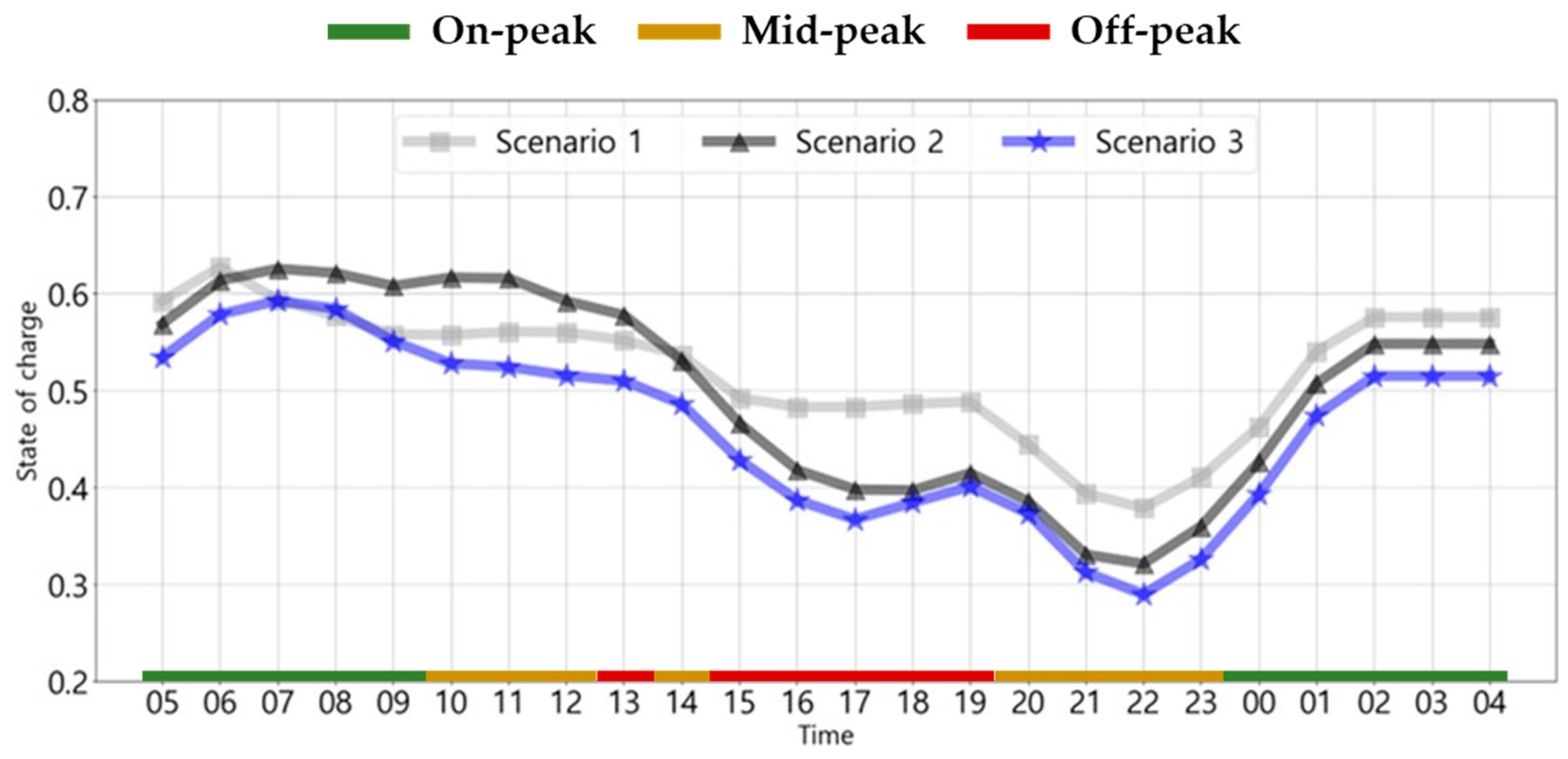 A comparison of the charging and battery degradation costs for the two scenarios is shown in Figure 4. Here, the hatched portions of the bar plots correspond to the battery aging cost in Scenario 1, which was calculated retrospectively. Compared with Scenario 1, Scenario 2 exhibited a reduction in the overall operating cost of 1.43, 12.3, and 5.69% in the spring/fall, summer, and winter seasons, respectively. Similarly, a comparison of Scenario 3 with Scenario 2 exhibited a reduction 0.198%, 0.303%, and 0.210%, respectively. These findings underscore the necessity of a charging strategy that considers battery aging and TOU. The cost of battery degradation decreased by 0.998%, 1.24%, and 0.779% in spring/fall, summer, and winter seasons, respectively, for Scenario 3 compared to Scenario 1, and by 0.795%, 1.24%, and 0.845% compared to Scenario 2. During winter, when energy consumption is at highest, the feasibility of implementing charging shifting is significantly constrained, thereby yielding minimal cost savings from battery degradation. During the spring/fall, energy consumption reaches its lowest, resulting in a relatively limited potential for cost savings, which in turn limits the overall impact of these savings. Consequently, it can be deduced that the savings rate is at its zenith during the summer. Charging costs decreased by 1.72%, 17.2%, and 7.82% in spring/fall, summer, and winter seasons, respectively, for Scenario 3 compared to Scenario 1. This demonstrates the most significant reduction during summer, when the disparity between off-peak and on-peak load charging costs is at its zenith. This is due to the fact that Scenario 1 did not take into account TOU. Additionally, the cost of charging in Scenario 3 exhibited an increase of 0.209%, 0.204%, and 0.0896% seasonally compared to Scenario 2. This finding suggests that Scenario 3, which was designed to achieve an overall reduction in operational costs, led to a reduction in battery degradation costs through the implementation of charging schedule adjustments. However, this was accompanied by a marginal increase in charging costs. Furthermore, the seasonal reduction rates are inversely proportional to energy consumption and charge/discharge volumes.