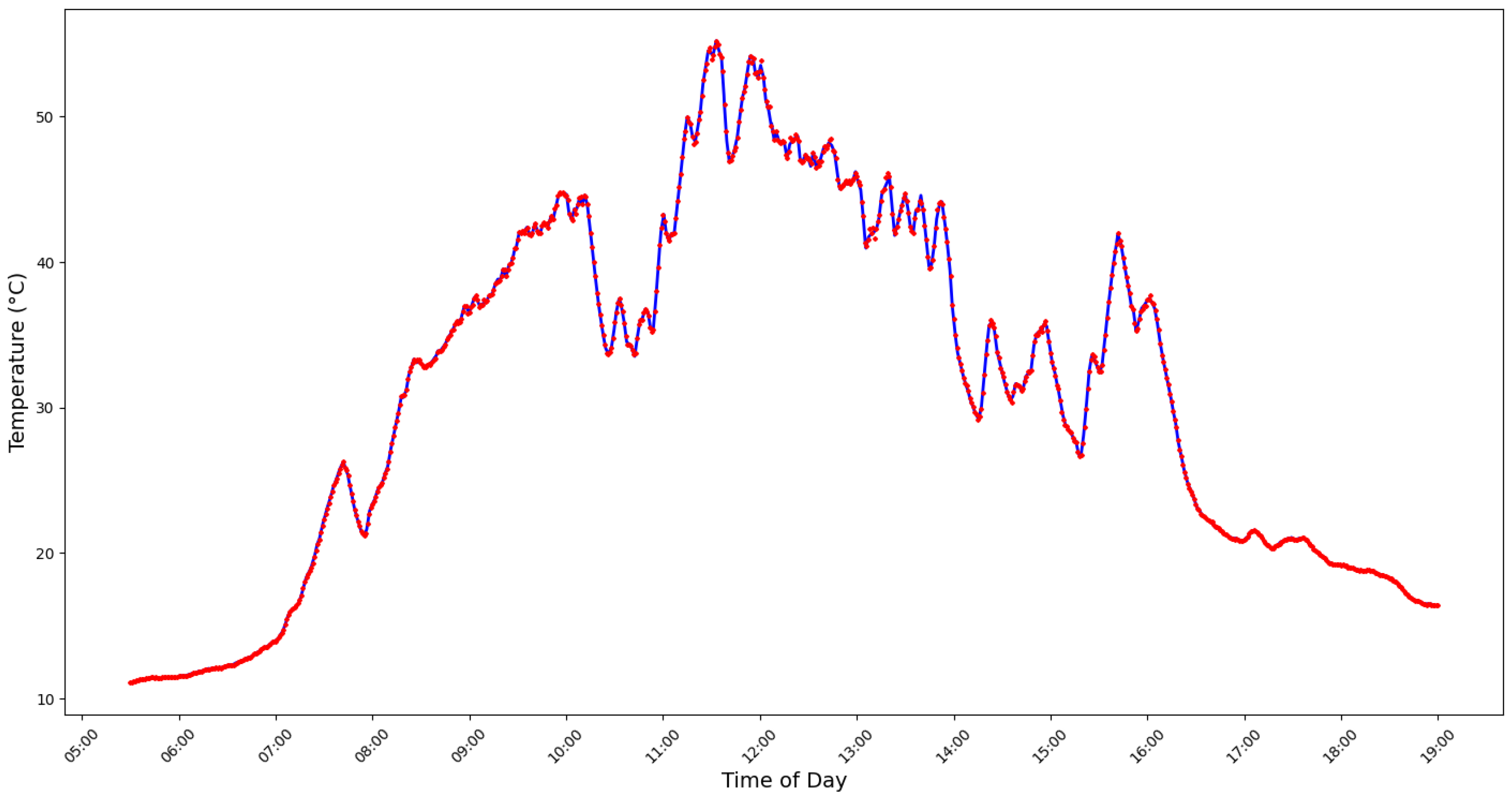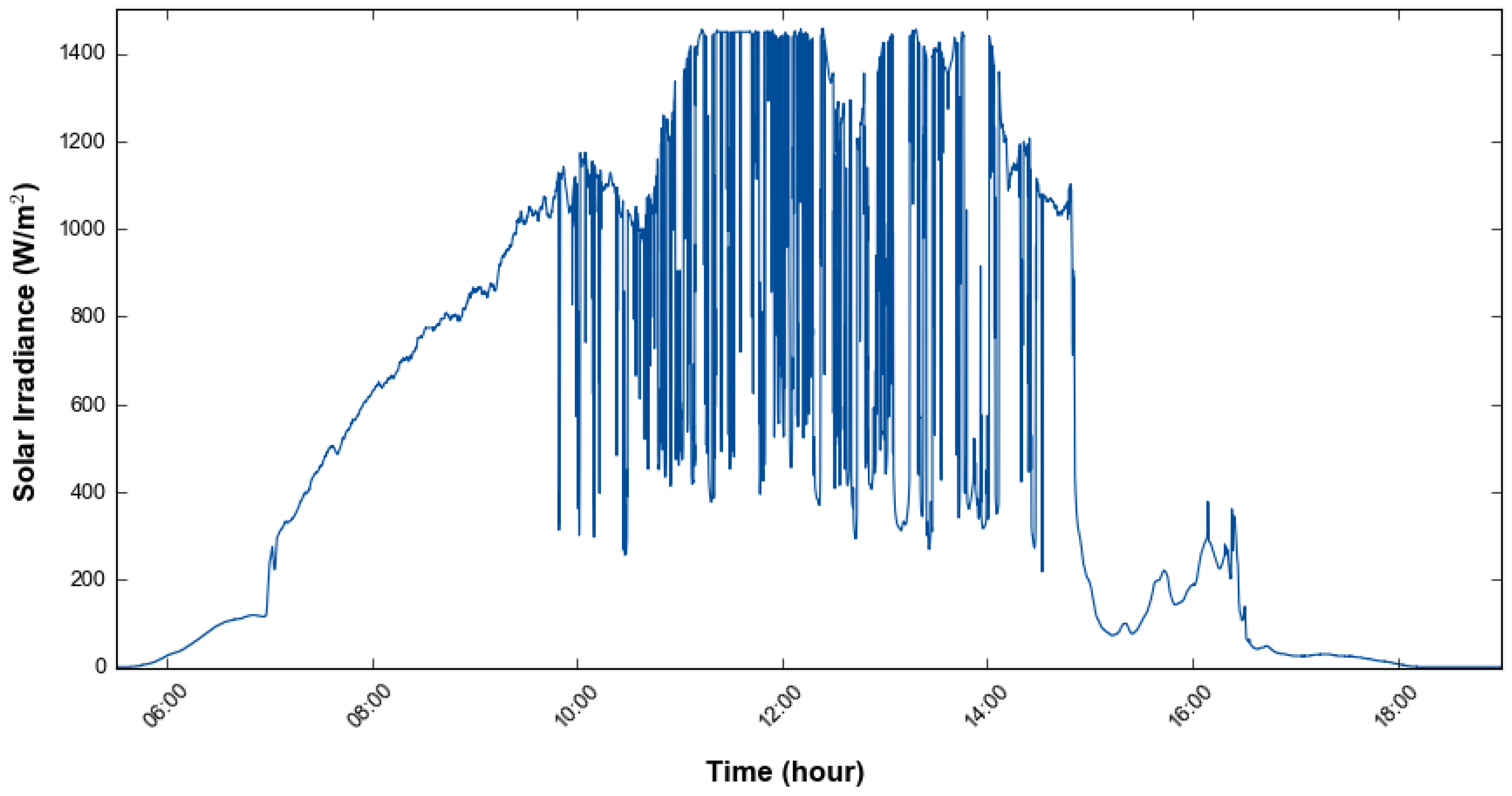 Figure 3 illustrates the solar irradiance measured on 16 April 2025, which reached a maximum value of 1449 W/m