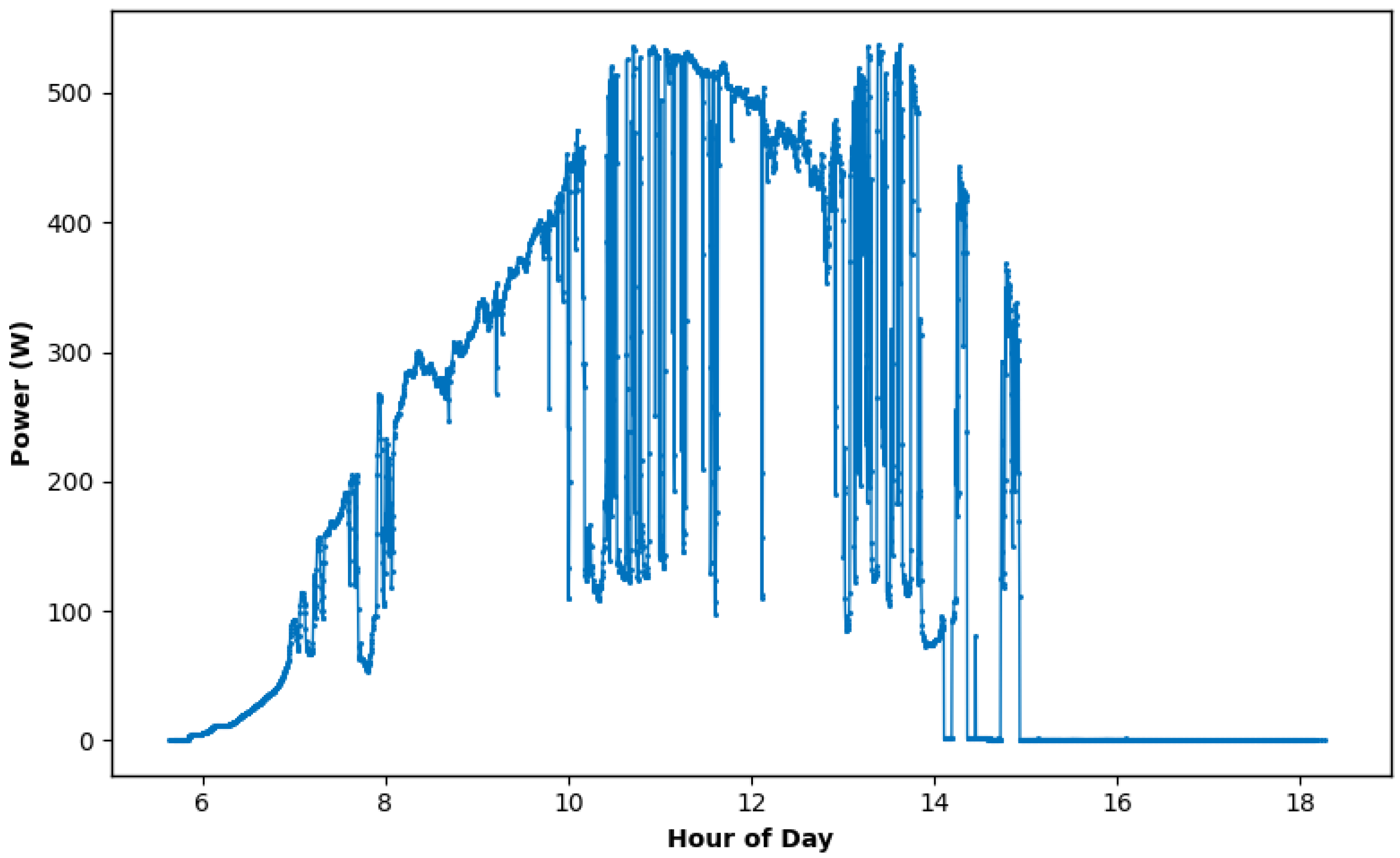 Figure 5 presents the DC power output profile of a single 550 W p-type PERC monocrystalline solar panel monitored over a typical day. The data captures the power generation pattern throughout daylight hours (approximately 6:00 to 18:00), with peak power outputs reaching approximately 550 W during optimal irradiance conditions around midday (10:00–14:00 h). The monitoring period reveals a characteristic diurnal curve with significant fluctuations attributed to cloud cover and atmospheric conditions typical of tropical highland regions. The profile shows a gradual power increase during morning hours (6:00–10:00), followed by highly variable output during peak solar hours with pronounced oscillations between 150 W and 550 W, indicating intermittent cloud cover. Notable short-duration drops in power generation are observed throughout the midday period, demonstrating the dynamic nature of solar irradiance under variable weather conditions. The power output gradually decreases during afternoon hours (14:00–18:00) until ceasing at sunset.