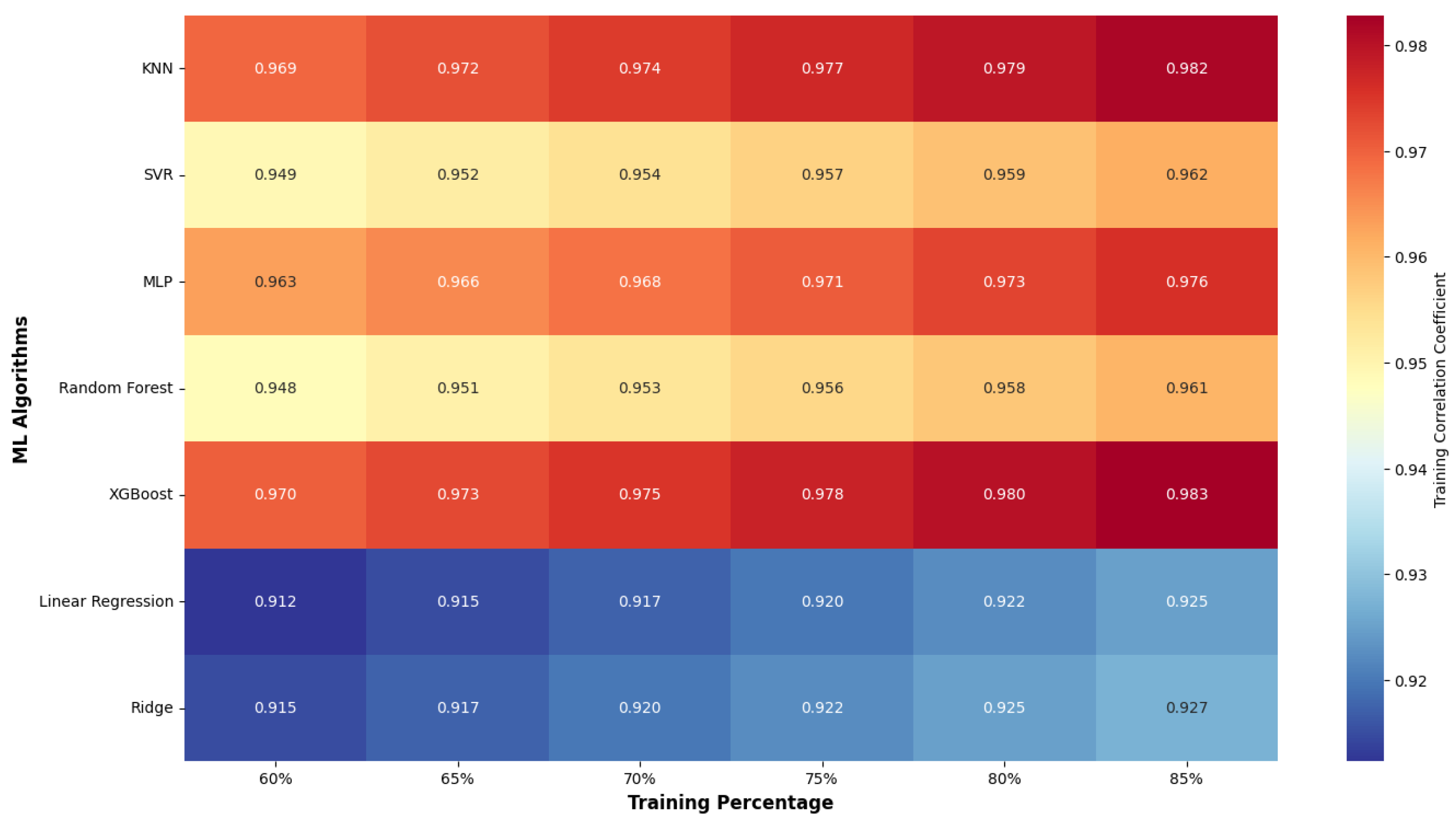Figure 7 presents a systematic analysis of training correlations achieved by seven machine learning algorithms when training data varies from 60% to 85% of the total dataset.