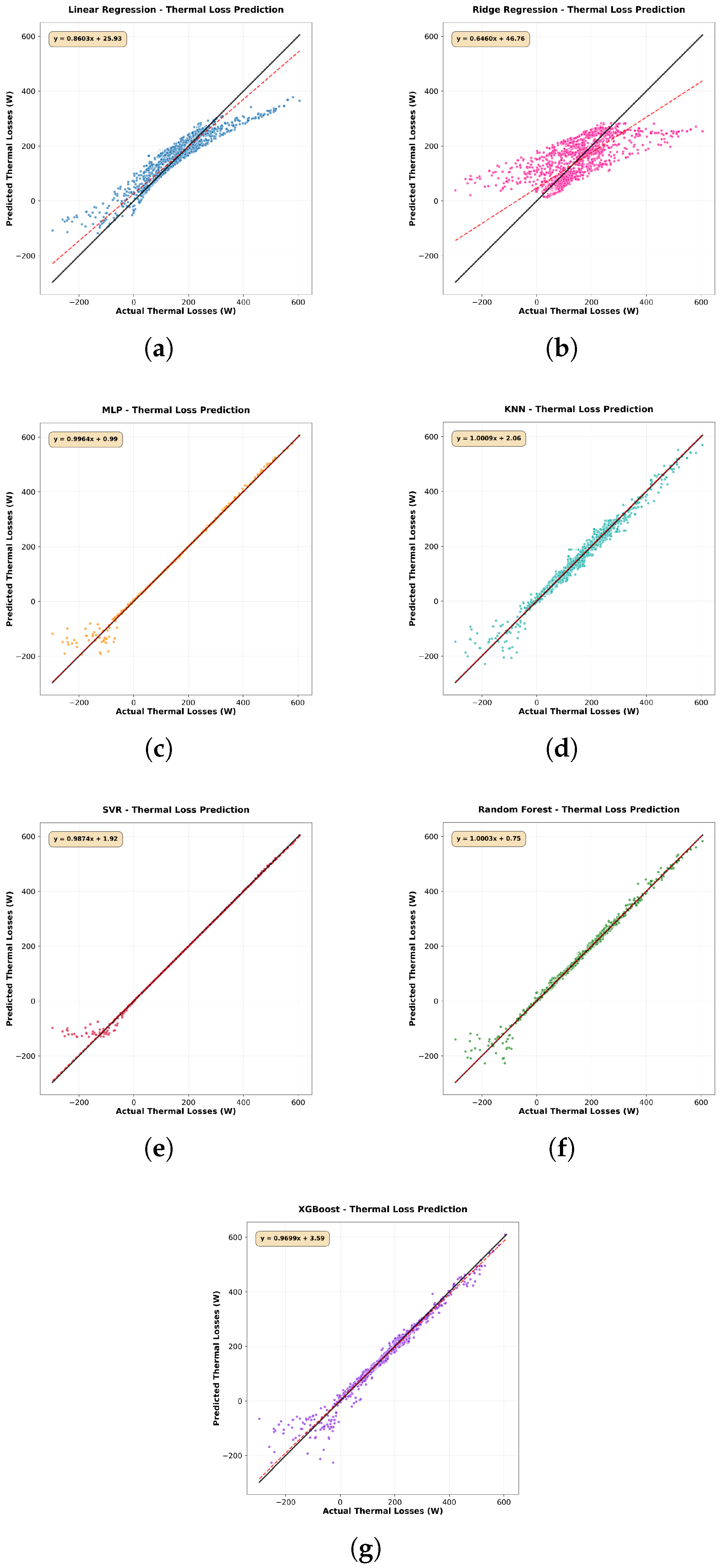 Figure 8e) displays good overall correlation but shows increased variance at higher thermal loss values, indicating potential challenges in extreme temperature conditions. Linear methods Ridge Regression (