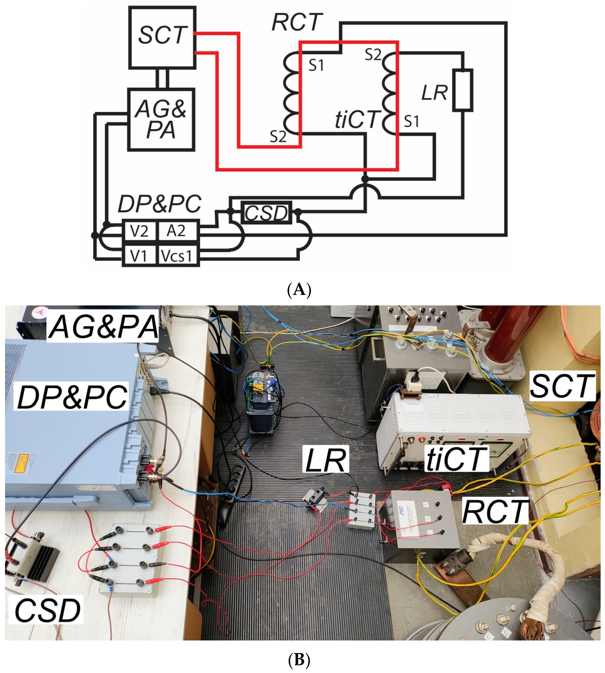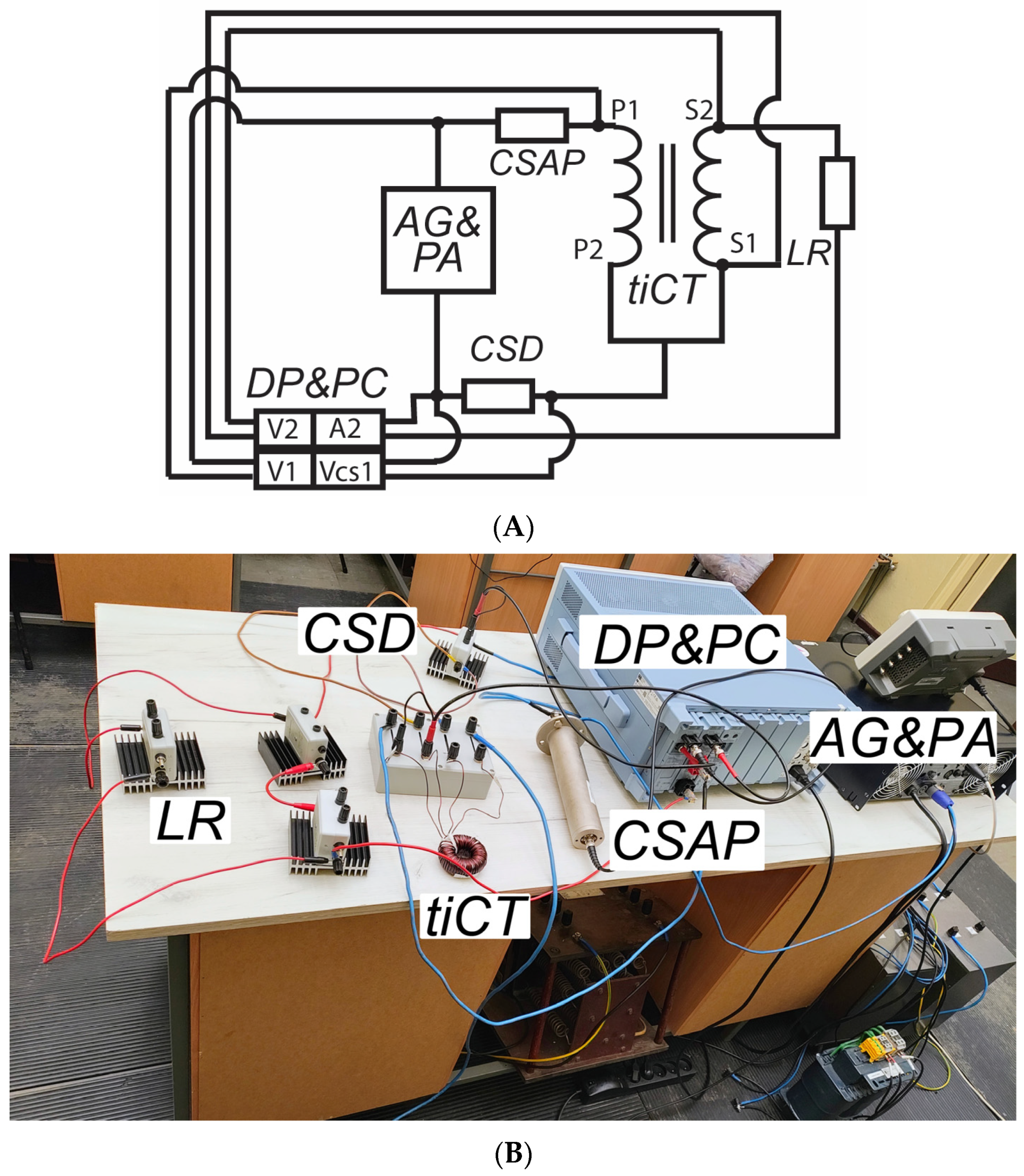 AG and PA—arbitrary waveform generator combined with an audio power amplifier, tiCT—tested inductive current transformer, DP and PC—digital power analyzer WT 5000 with data acquisition into computer, CSD—resistive, non-inductive current shunt used to measure differential current, CSAP—resistive, non-inductive current shunt used to measure current in the auxiliary winding, LR—resistive, non-inductive current shunt used to provide a load for the secondary winding of the tiCT.