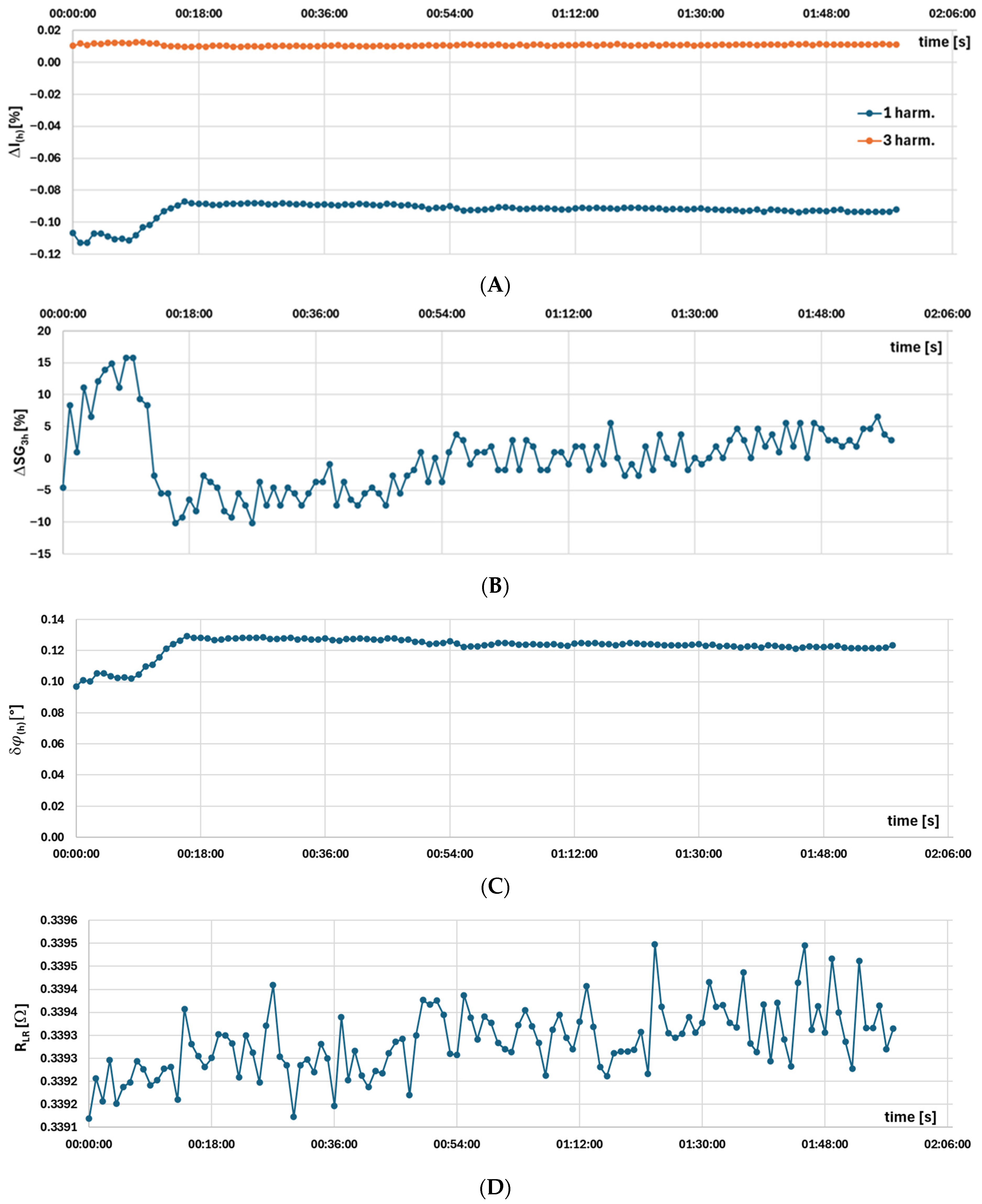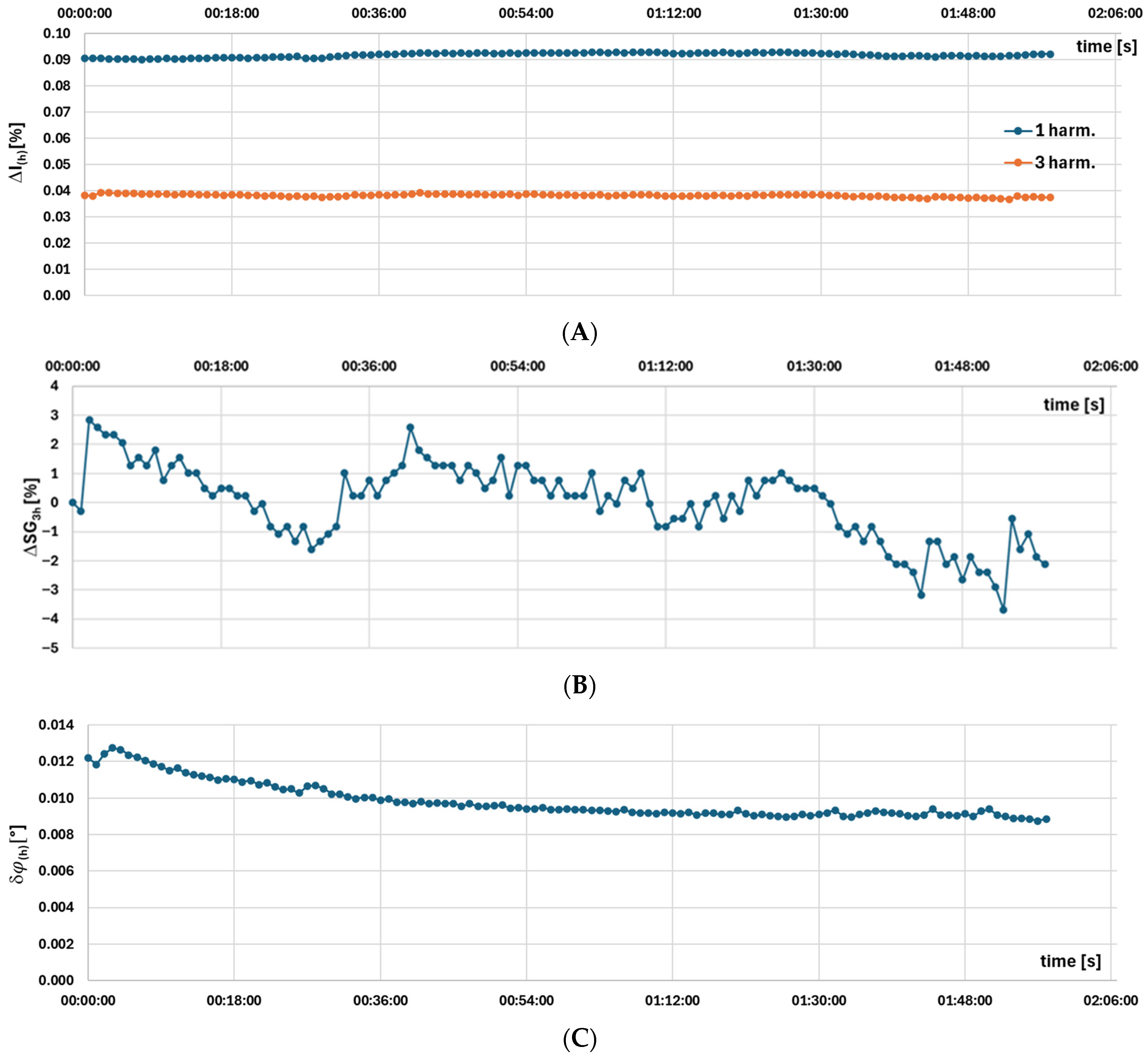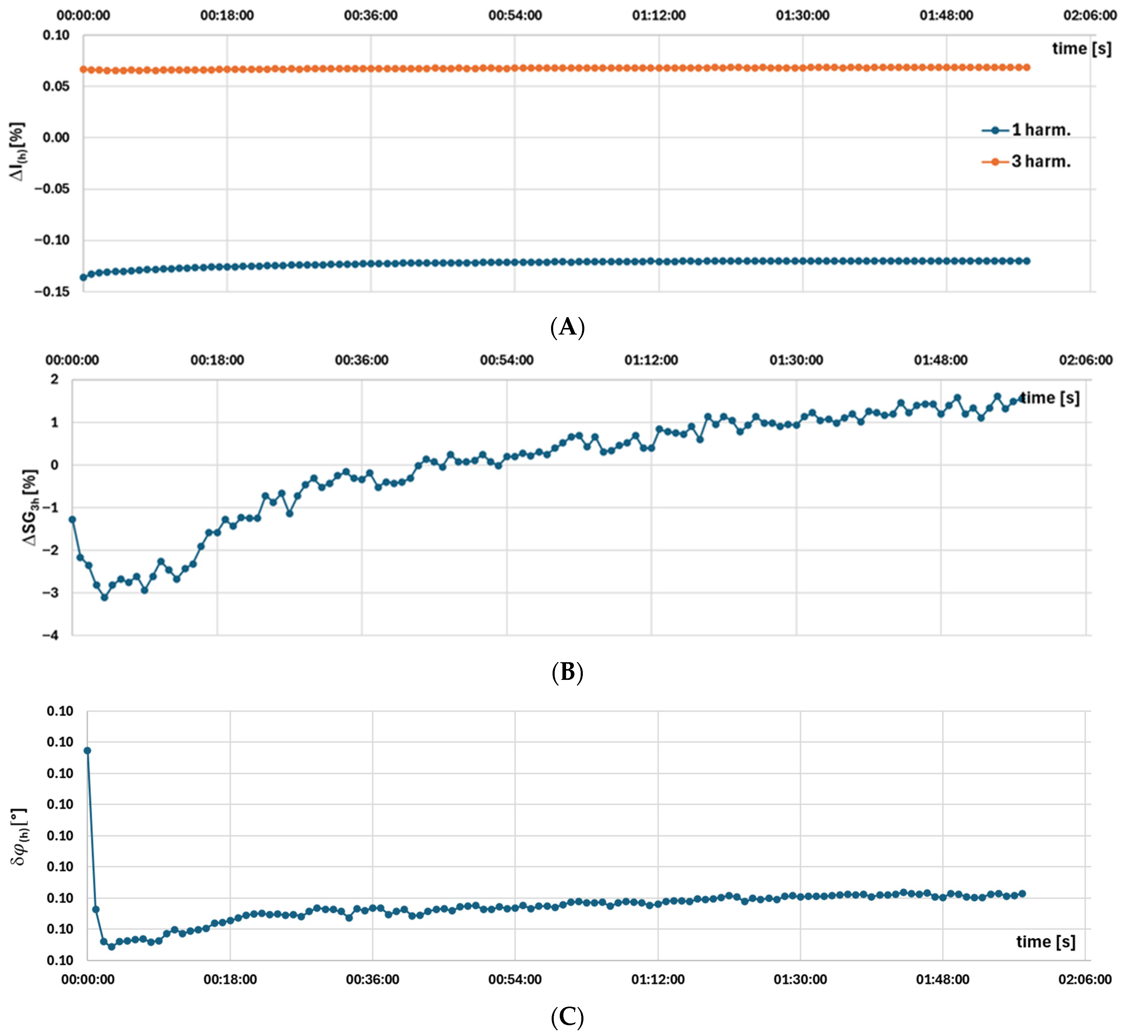 Figure 5A indicate that the current error changes from approximately −0.14% to −0.12% during the first 36 min of the test. In this case, the manufactured iCT shows an improvement in accuracy over time. The active power of the secondary winding load was 2.5 W, and the test was performed under conditions simulating the rated primary current: 5 A RMS, using 100 turns in the additional primary winding. The percentage change in the self-generated third harmonic relative to the average measured value is relatively low (