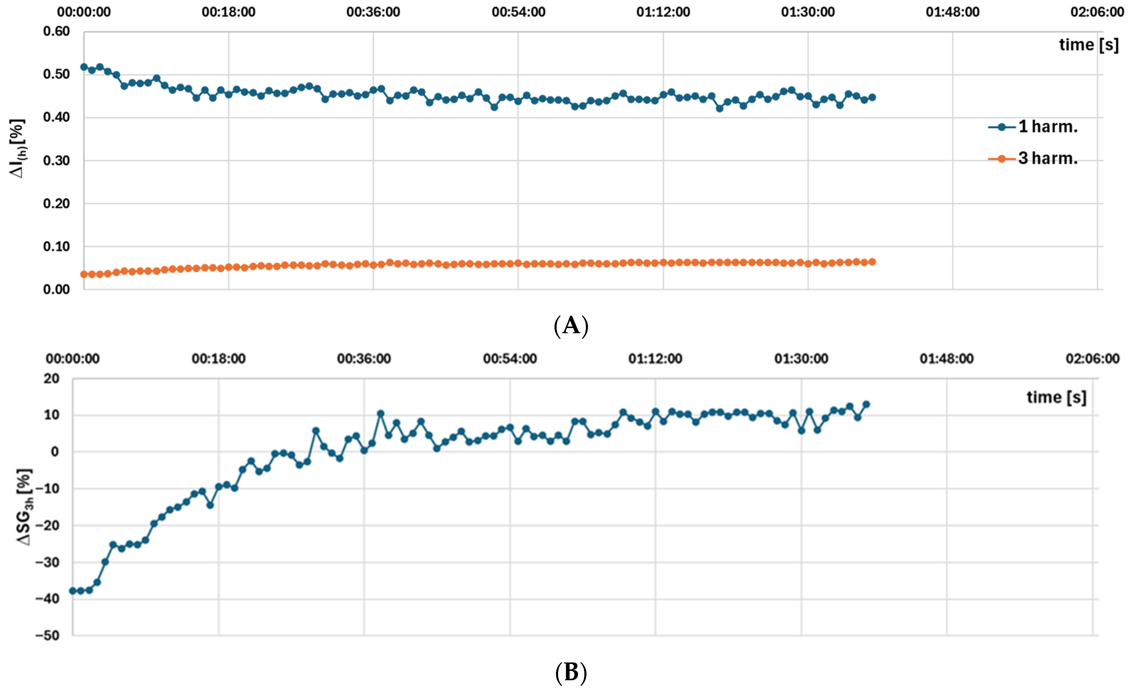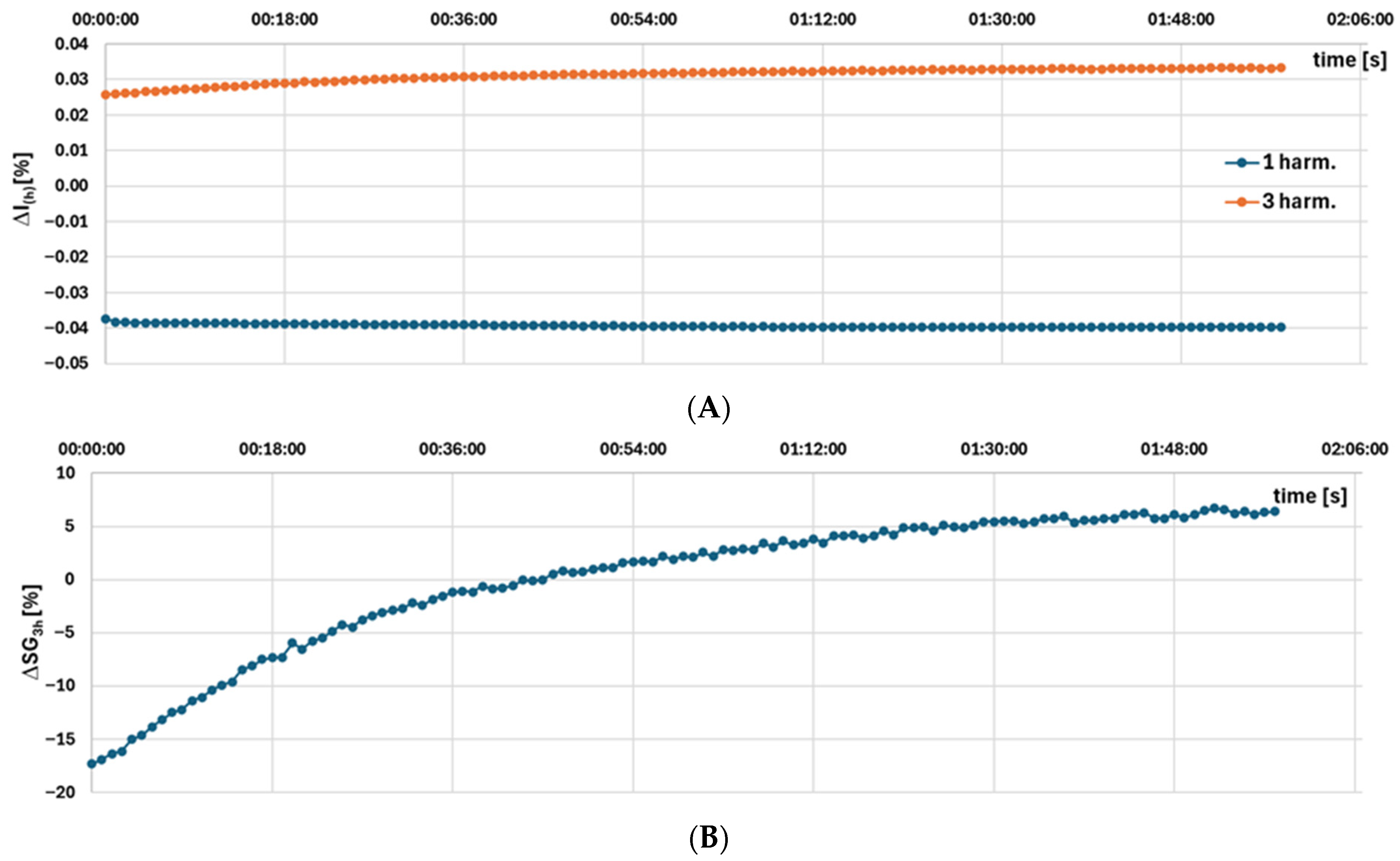 Figure 7A indicates that the change in current error is from about −0.03% to −0.08% for the 2 h test. In this case, model D of iCT 250 A/1 A (class 0.5, 2.5 VA produced by manufacturer 2) is deteriorating its accuracy performance as the temperature of secondary windings increases to 85 °C. It should be noted that the secondary winding load active power is intentionally reduced during this test to 1 W at 1 A RMS rated secondary current. This action is intended to assess also the influence of the secondary winding load on the thermal stability and warm-up time of iCT. It was observed that the percentage range of changes in the current error percentage value is the same, but in the case of its higher value, typically at higher secondary winding load, the absolute change is greater and more easily visible. The percentage change in the self-generated third harmonic relative to the average measured value is quite high (