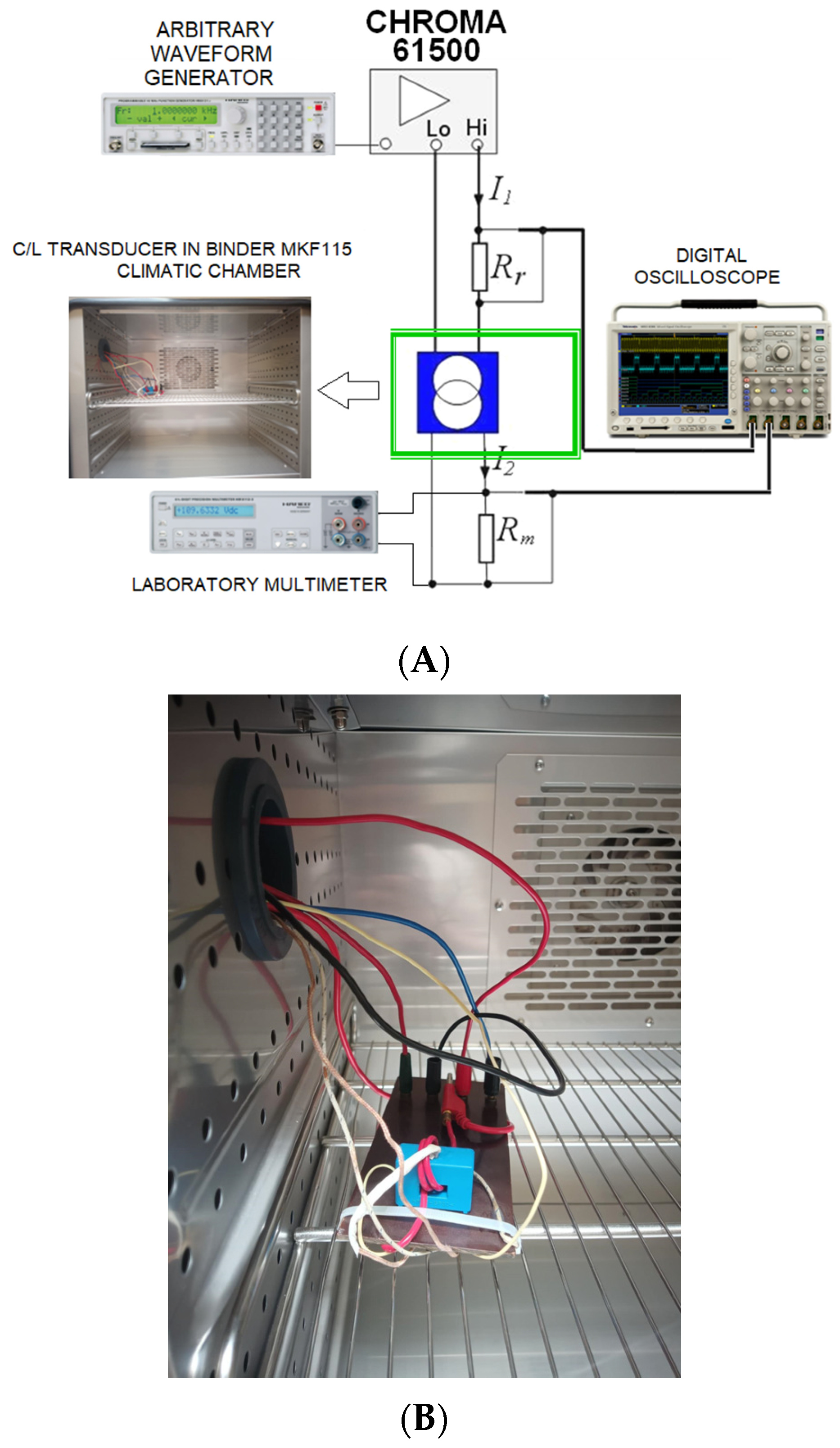 27]. The values of current error and phase displacement were monitored over a period of two hours. In addition, the magnitude of the third harmonic generated in the secondary current was measured. Moreover, to verify the stability of the operating conditions of the tested iCT, the primary and secondary current, along with the secondary voltage, were monitored continuously during the test. In all cases, the required warm-up time for the measuring equipment and connected load was ensured through prior testing of the transformation accuracy using the same type of iCT. During this study, both standard measurement setups typically used to evaluate the transformation accuracy of iCTs were applied: the ampere-turns method (used when an additional primary winding could be implemented) and the reference iCT method. In all cases, a digital power meter and a current comparator were used to perform measurements. A climate chamber was used to simulate environmental extremes by setting limiting conditions such as maximum temperature of +50 °C and an intermediate value of +10 °C with humidity levels from 10% to 90% (with 10% steps) and a minimum temperature of −25 °C for evaluation of iCTs performance for various ambient conditions (tests with the ampere-turns method). Moreover, a freezer was used to force their ambient temperature to −25 °C during the accuracy tests with the reference iCT for a single primary conductor. To assess the influence of temperature on the operation of the zero-flux transducer, the secondary current was measured at a reference value of the primary current supplied by a programmable power source. The relative error of converting the primary current into the secondary current referenced to the stabilized operating temperature inside the transducer housing under nominal ambient conditions was then determined. The test signals were sinusoidal and distorted (with a 30% level of the third harmonic) currents of frequency from 50 Hz to 10 kHz (30 kHz third harmonic). The ambient temperature of the tested transducer was controlled using a BINDER MKF 115 climatic chamber, which in this case was used for testing in the range from +20 °C to 150 °C.