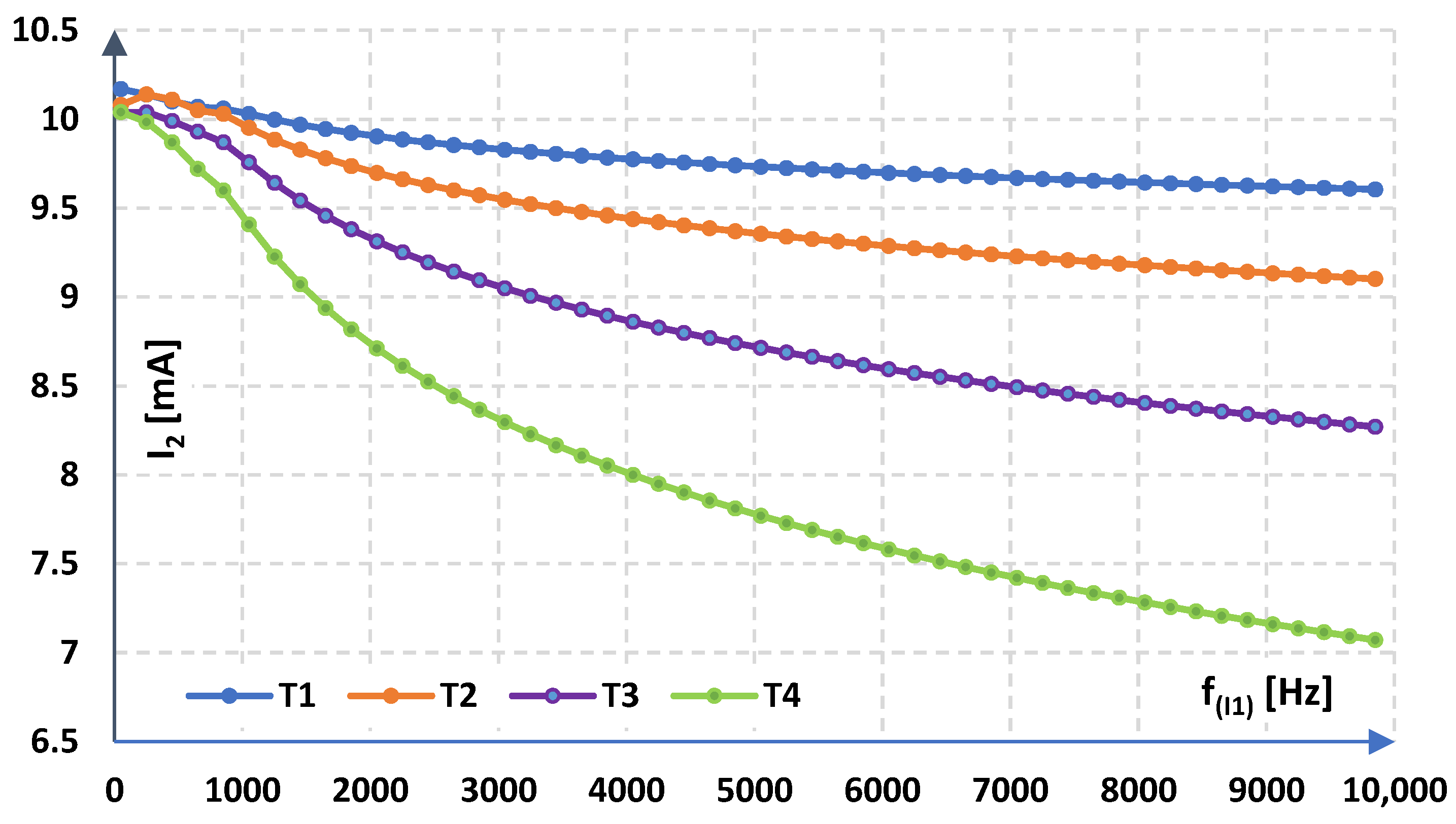 Figure 14, a noticeable deterioration in the conversion accuracy of the sinusoidal current can be observed. The decisive factor is the change in the geometric parameters of the magnetic core, which alters its reluctance and thereby the impedance of the closed-loop current transducer’s compensation circuit. This causes the load on the transistors driving the compensation circuit to change as well. In