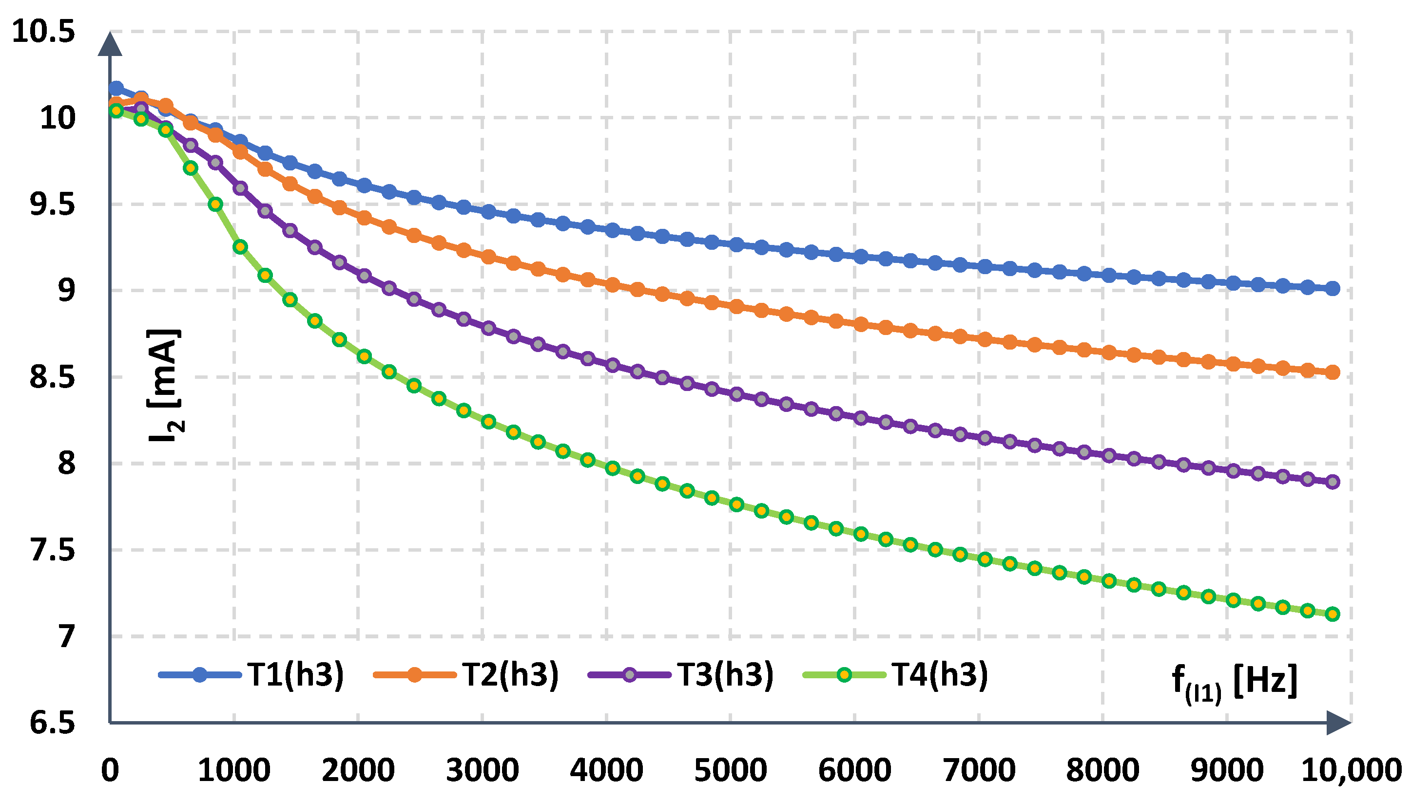 The changes in the RMS values of the secondary current with the frequency of the primary current distorted with a third harmonic (30% level) for tested ambient temperatures are shown in