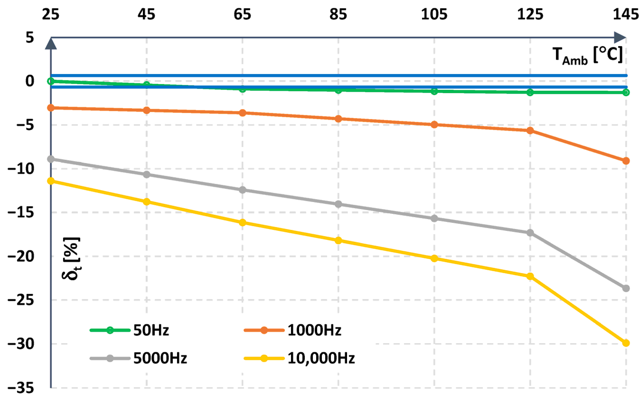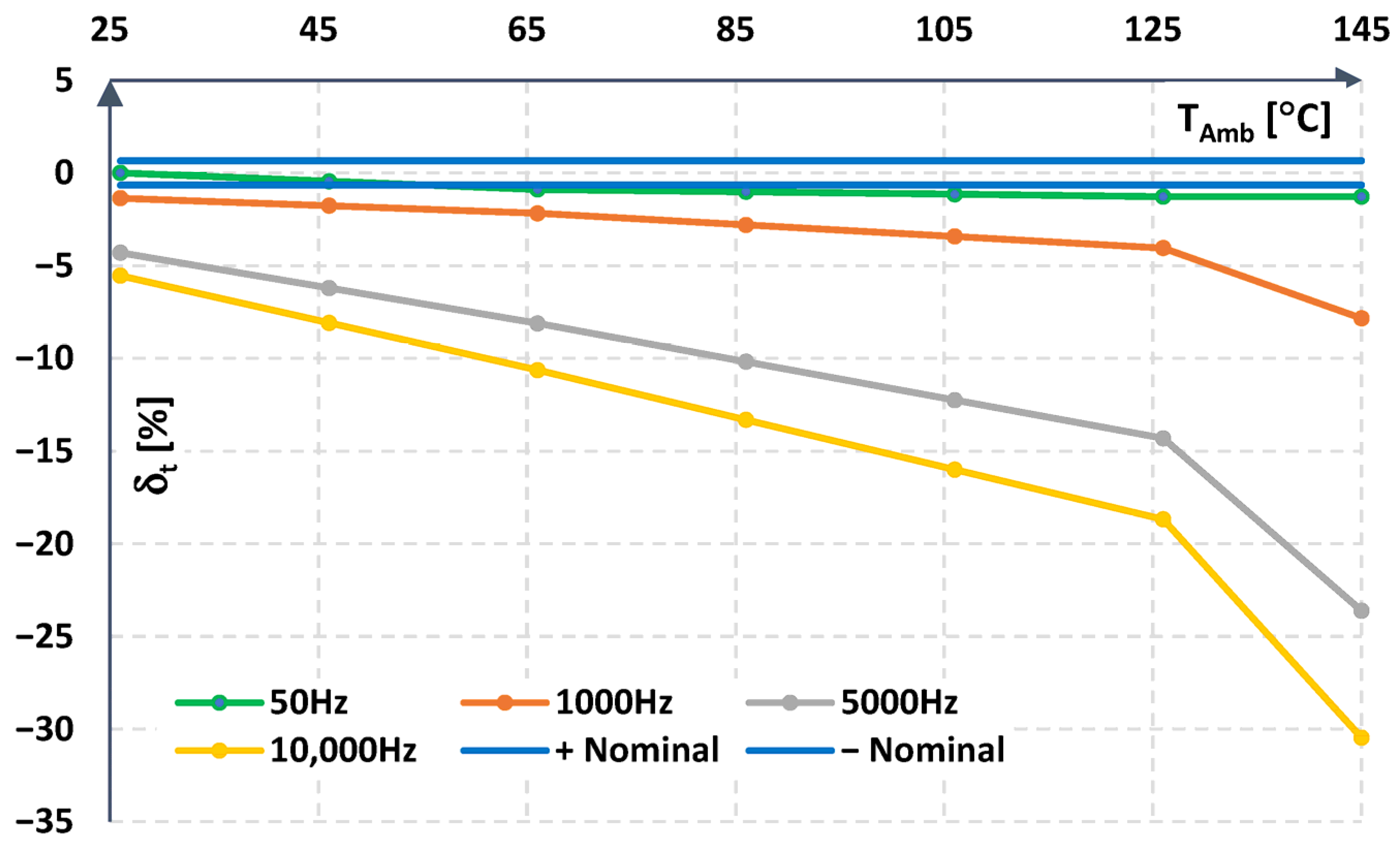Figure 14 shows the relative error values obtained when converting the sinusoidal primary current to the secondary current across ambient temperatures ranging from 25 °C to 145 °C at the selected primary current frequency.