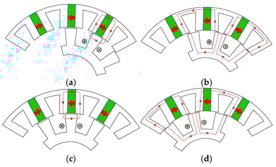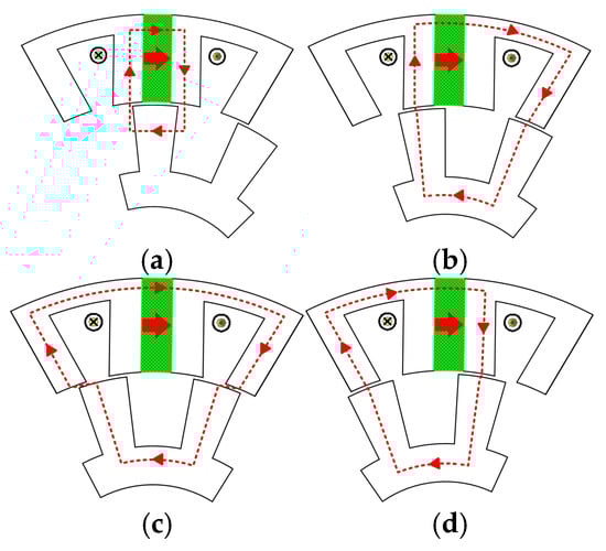 The PM-stator armature torque component is equivalent to that of the conventional SP-FSPM machine based on the flux-switching principle. The working principle and the corresponding flux linkage of the stator armature component are presented in Figure 2 and Figure 3. Flux linkage in the stator coil is zero when the rotor tooth is aligned with the PM (Figure 2a) or the stator slot (Figure 2c). When the rotor tooth aligns with either of the stator teeth (Figure 2b,d), positive or negative flux linkage is achieved. The stator coil flux varies with the rotation of the rotor, inducing back-EMFs.