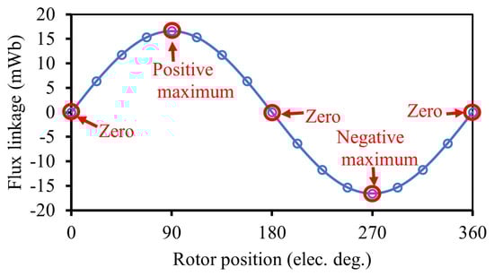 The PM-stator armature interaction exhibits a similar manner to that of the interior PM machine. Rotor flux linkage is zero when the rotor tooth is aligned with the stator PM (Figure 4a,c). Positive and negative maximum flux linkage (Figure 4b,d) is obtained when the rotor tooth is aligned with the stator slot. Rotor rotation varies flux linkage (Figure 5), inducing back-EMFs in rotor armature windings.