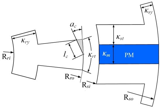 This section presents a comparative analysis of the electromagnetic performance between the proposed SP-DF-FSPM machine and the conventional SP-FSPM machine. Both machines are optimized by a sequential optimization methodology to maximize the output torque. The process involved the iterative refinement of key geometric parameters, namely, the split ratio, magnet arc, stator tooth arc, stator yoke thickness, rotor tooth arc, rotor yoke thickness, and rotor tooth chamfer, where each subsequent parameter was optimized while holding previously adjusted parameters at their optimal values. The resulting optimal parameters are detailed in Table 2 and Figure 15. Discrepancies between the outcomes of this sequential approach and isolated optimizations arise from the strong interdependencies among these parameters. Notably, the optimal split ratio, stator tooth arc to stator pole pitch ratio, and rotor yoke thickness to rotor tooth arc ratio differ substantially between the SP-DF-FSPM and SP-FSPM topologies. However, the optimal ratios for stator yoke thickness to stator pole pitch, magnet arc to stator pole pitch, and rotor tooth arc to rotor tooth pitch are rather consistent across both machine types.