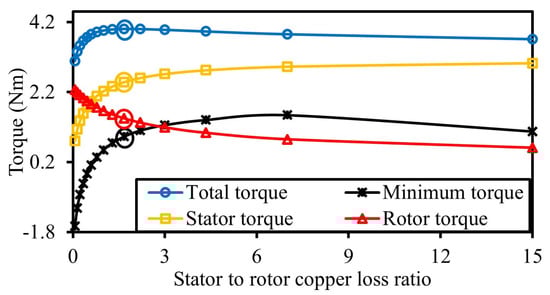 Influence of stator to rotor copper loss ratio on average torque and minimum torque.
