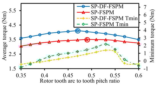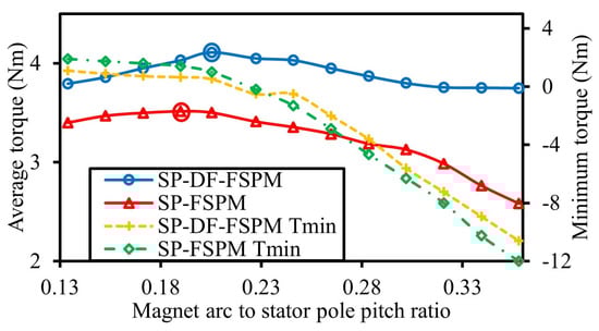 Figure 9 depicts the relationship between the magnet arc and the average torque. Increasing the magnet arc enhances the PM flux but simultaneously reduces the stator slot area, thus limiting the stator armature current. It is noteworthy that, in the SP-DF-FSPM machine, the rotor slot area and consequent rotor armature current remain unaffected by this geometric variation. The wider PMs increase flux linkages in the rotor coils and hence increases their electromagnetic torque contribution. Consequently, the SP-DF-FSPM machine is designed with a larger optimal magnet arc than the SP-FSPM machine. This design choice, however, can increase cogging torque and torque ripple. Similarly to the influence of the split ratio, the increased magnet arc negatively affects the minimum torque.