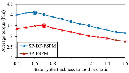 A reduced magnetic flux passes through the yoke in comparison to the stator tooth, which is reflected in the lower flux density. Therefore, the design necessitates a stator yoke thickness that is less than the stator tooth width. As the stator yoke thickness increases, the reduction in reluctance results in a slight increase in the PM flux. Nevertheless, it also leads to smaller stator slots and hence reduced stator currents. As illustrated in Figure 12, the torques of both the SP-FSPM and DF-SP-FSPM machines only increase a bit but then decline markedly. Therefore, the respective optimal yoke thicknesses for the SP-DF-FSPM and SP-FSPM machines are determined to be approximately 0.6 and 0.7 times the stator tooth width. This design optimizes flux densities and maximizes the stator slot area.