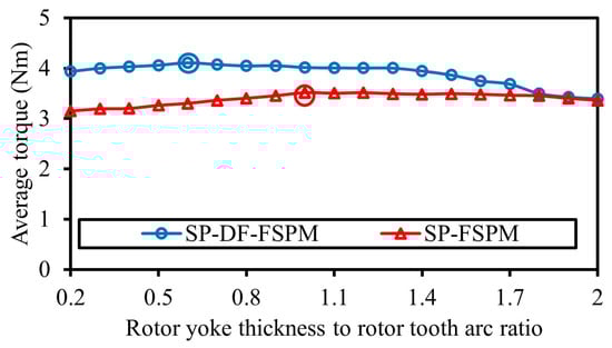 As illustrated in Figure 13, the average torque of the SP-FSPM machine remains largely unaffected by rotor yoke thickness, except under extreme geometric conditions. An excessively narrow yoke increases the saturation and reluctance, while an overly thick yoke reduces stator flux linkage and increases flux leakage. In contrast, the average torque of the SP-DF-FSPM machine exhibits a pronounced sensitivity to rotor yoke thickness due to its direct influence on the rotor armature current. Consequently, the optimal rotor yoke thickness for the SP-DF-FSPM machine is approximately 0.6 times the rotor tooth dimension, a value significantly less than that required for the SP-FSPM machine.