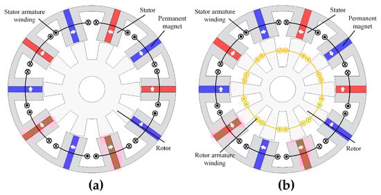 In recent years, FSPM machines have been extensively investigated as one of the most promising stator-PM topologies, owing to its high torque capability and compact structure []. Their key advantage is that PMs are embedded in the stator, which houses the windings as well, allowing for a simple, robust salient-pole rotor. Thus, this configuration merges the mechanical durability of SRMs with the high efficiency and power factor of PM machines. Nevertheless, a fundamental design constraint remains: the placement of magnets within the stator core significantly reduces the available slot area for windings, which limits torque density [,]. To increase the slot area, partitioned stator topologies are proposed in [,,] which separates the PMs. These partitioned stator machines have a double air gap, and the rotor is sandwiched between the stator components. This structure better utilizes the inner space of the machine, hence improving the torque density. However, this approach results in complicated machine structure and increase in manufacturing costs. Furthermore, enhancing the fault tolerance of FSPM machines for high-reliability applications often necessitates complex strategies such as increasing the number of phases, single-layer windings, or adding redundant windings [,,,,]. These solutions increase costs, control complexity, and inverter requirements. A double-armature configuration was later proposed for poly-phase FSPM machines to simultaneously enhance torque density and fault-tolerant capability []. By augmenting the conventional design by integrating an additional armature winding within the rotor slots, this configuration directly leverages the previously unused rotor slot area, thereby increasing the electrical loading, and hence the torque density. Furthermore, the dual-armature winding structure inherently provides fault tolerance, as the stator and rotor windings can operate independently, introducing a layer of operational redundancy. The dual-armature technique has also been successfully applied to other poly-phase stator-PM machines like flux-reversal machines [] and doubly salient machines [].