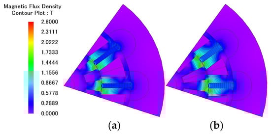 Figure 20 illustrates the on-load magnetic field distribution and flux densities for both machine topologies operating under a fixed copper loss constraint of 40 W. The flux densities observed throughout the core structures remain below the material’s saturation threshold, approximately 1.85 T. Notably, the SP-DF-FSPM machine exhibits no discernible saturation despite its comparatively slimmer rotor yoke.