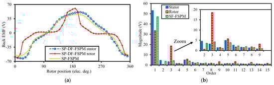 Back EMFs of the SP-FSPM and SP-DF-FSPM machines. (a) Waveforms. (b) Spectra.