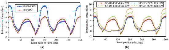 Instantaneous torque waveforms of SP-FSPM and SP-DF-FSPM. (a) Normal condition. (b) Fault-tolerant.