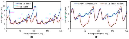 It should be noted that, different from three-phase FSPM machines, conventional SP machines also face a well-documented limitation in their self-starting capability. This is due to the presence of a “dead zone” at certain rotor positions where the starting torque is zero. Consequently, significant research has been devoted to mitigating this problem via geometric optimization of the machine’s rotor and stator to introduce magnetic asymmetry in the air gap, including the use of segmented or auxiliary rotors, the application of stator tooth chamfering, and the design of sub-rotors with non-uniform tooth widths.