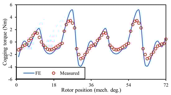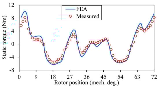 Static torque characteristics are evaluated by adopting the cogging torque measurement technique elaborated in []. Figure 25 presents a cogging torque comparison between the measured waveform and the corresponding FEA predictions. The experimental results confirm the simulated results. However, the measured peak torque values are marginally lower than those predicted. This divergence is primarily a consequence of mechanical and assembly tolerances inherent in the prototype.