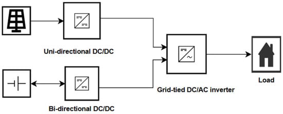 The PV array interfaces with the DC bus through a unidirectional DC/DC converter, while the battery connects via a bidirectional DC/DC converter for charging and discharging. A unidirectional DC/AC converter links the DC bus to the load/grid, ensuring regulated AC power delivery.
