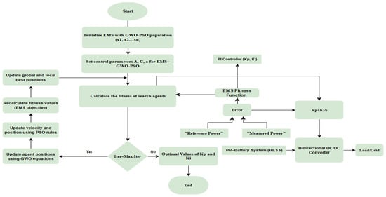 The EMS–GWO–PSO flowchart, as shown in Figure 2, starts with initializing the EMS using a GWO–PSO population (x1, x2, xn) and setting control parameters (a, A, C) for the optimizer. The fitness evaluation phase measures the difference between reference and actual power from the PV–battery system, processed through the EMS fitness function. This function aims to minimize conversion losses, improve dynamic response during transitions, and align with load dynamics and overall power balance. Based on this error assessment, potential PI controller parameters (Kp, Ki) are evaluated, and performance feedback is sent to the optimizer. The GWO–PSO algorithm iteratively adjusts agent positions using GWO equations and PSO velocity updates, recalculating fitness values and refining solutions until the maximum iterations are reached. Once the stopping criterion is met, the optimal PI controller gains are identified and implemented in the bidirectional DC/DC converter, managing power exchange between the PV–battery system and the load/grid. This coordinated approach ensures stable DC bus voltage, regulated battery operations, and reliable grid support under varying conditions.