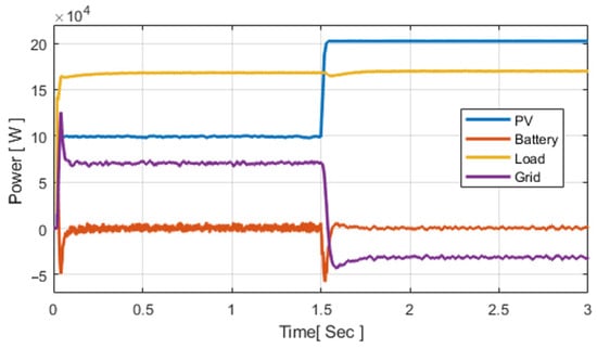 The overall system power balance is evaluated using Equation (27) and Figure 3 illustrates the PV, grid, battery, and load powers at the point of common coupling (PCC).