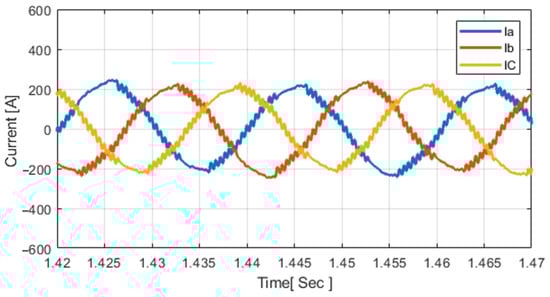 The three-phase currents remain sinusoidal, balanced, and phase-shifted by 120° throughout the simulation, confirming stable EMS tracking and high-quality waveform regulation under GWO-based control. Figure 4 confirms that the inverter output currents remain balanced, and 120° apart during steady-state operation, consistent with the waveform stability demonstrated by Obaid et al. [].