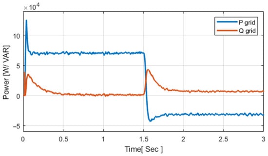 At 1.5 s, the active power increases sharply while reactive power remains near zero, confirming stable operation. Similar inverter regulation with minimized reactive oscillations was reported by Srimati and Vijaykumar [] and validated in hybrid optimization studies by Nguyen and Nguyen [].