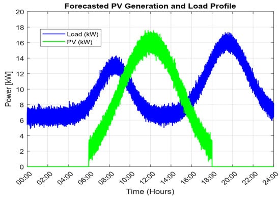 Forecast-based daily load and PV generation profiles are used for EMS scheduling. Figure 7 presents the 24 h demand and PV generation curves with variability added to simulate cloud fluctuations.