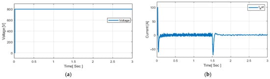 Battery voltage and current response are shown during a PV power step at 1.5 s. The DC bus voltage remains stable at ~800 V, while the battery current shifts from light discharge to charging. A short transient spike is observed at the step event, reflecting inverter and converter switching dynamics. After this, the battery absorbs surplus PV power smoothly, and the system returns to steady operation. Comparable studies confirm similar behaviour: Srimathi and Vijaykumar [] reported stable DC bus regulation in PV–battery microgrids during sudden disturbances; Assiene Mouodo et al. [] highlighted that accurate SOC estimation ensures reliable current transitions; and Nguyen and Nguyen [] showed that hybrid PSO–GWO enhances voltage stability in smart grids. These observations support the robustness observed in both voltage and current waveforms in this work. In addition, Srimathi and Vijaykumar [] also demonstrated consistent voltage stability in DC microgrids under switching events, while Vaidya et al. [] confirmed effective current control in EV–PV charging systems, and Nguyen and Nguyen [] reported that PSO–GWO reduces oscillations and improves transient response. The present study not only matches well with these outcomes but also achieves faster settling and smoother current dynamics.