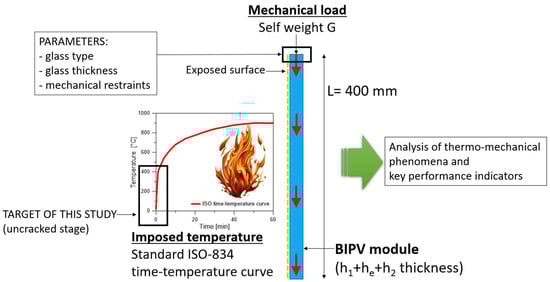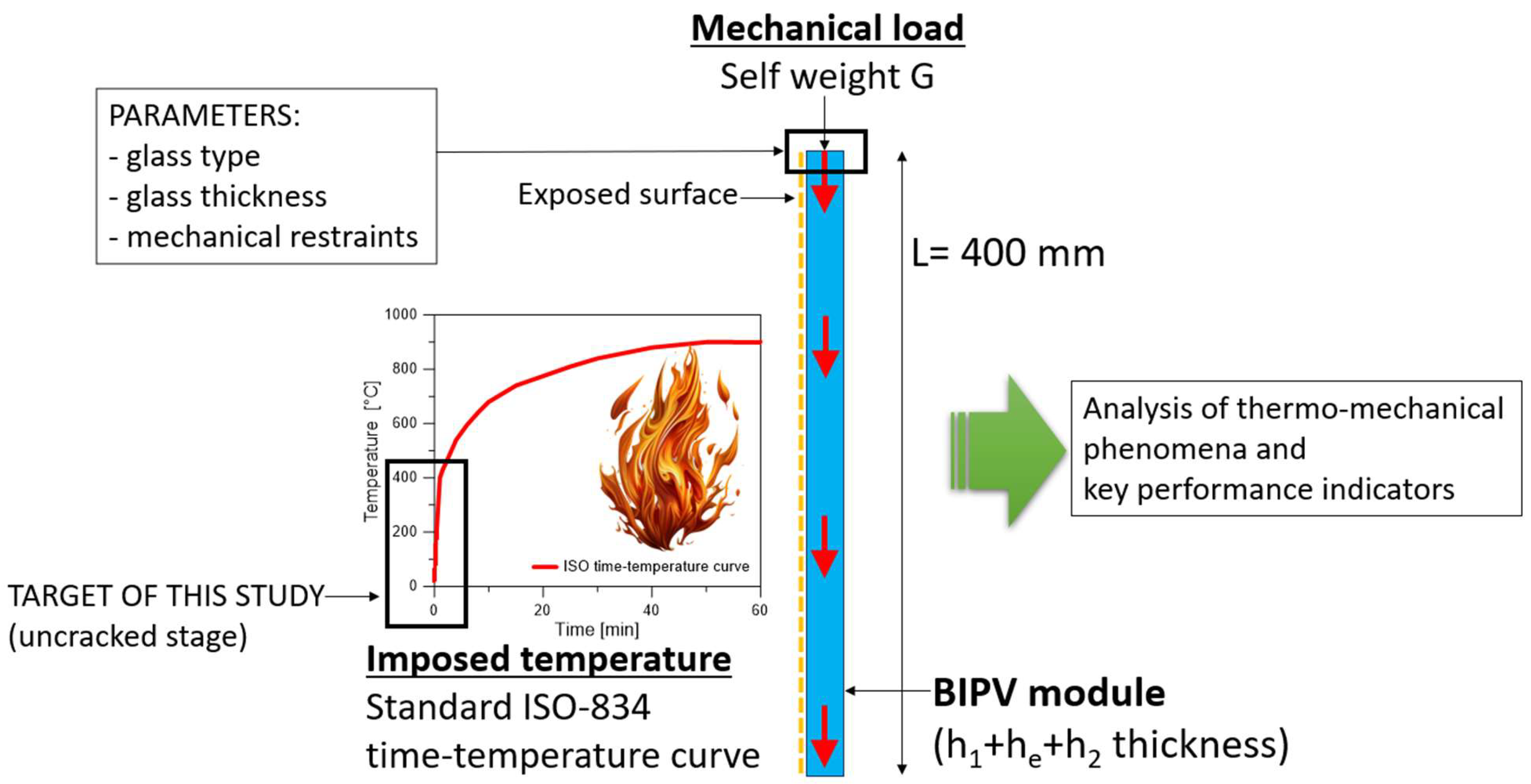 To explore the thermo-mechanical performance of a selection of glass–glass BIPVs subjected to increasing temperatures, this paper is focused on the analysis of thermal and mechanical effects in the first heating stage (i.e., before glass fracture), which is of utmost importance to assess the load-bearing response of the BIPVs [,].