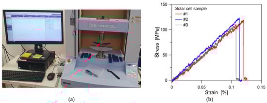 Three-point bending experiments on solar cell samples at room temperature: (a) test setup and (b) typical stress–strain results.