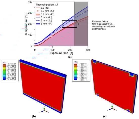 In this regard, it is important to note that the performance of AN and HS glass solutions was taken into account (for the 4L configuration) in a preliminary stage of the study, to emphasize the different responses of several glass types to the imposed thermal scenario. The majority of the simulations were subsequently carried out for the tempered glass samples only (FT). In parallel, the reference FE model of Figure 3 was adapted to reproduce different boundary details and exposed/unexposed surfaces (Table 1).