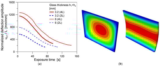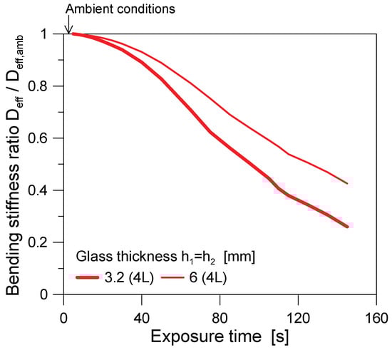 Finally, considering the parametric results in terms of exposure time to elevated temperatures, the numerical estimates can be used to directly quantify the reduction in out-of-plane bending stiffness for the examined BIPV systems. The examples reported in Figure 16 refer to the 4L boundary configuration, and the effects when changing the cross-section details. The Deff value is calculated at different periods of exposure time and compared with the initial stiffness value at ambient conditions, Deff,amb. Notably, the stiffness ratio reflects the high sensitivity of thin glass covers (3.2 + 3.2 mm) to any possible temperature increase, which indeed is less pronounced for the 6 + 6 mm system.
