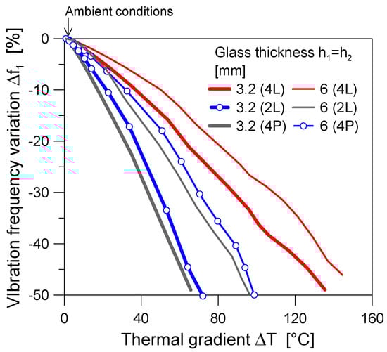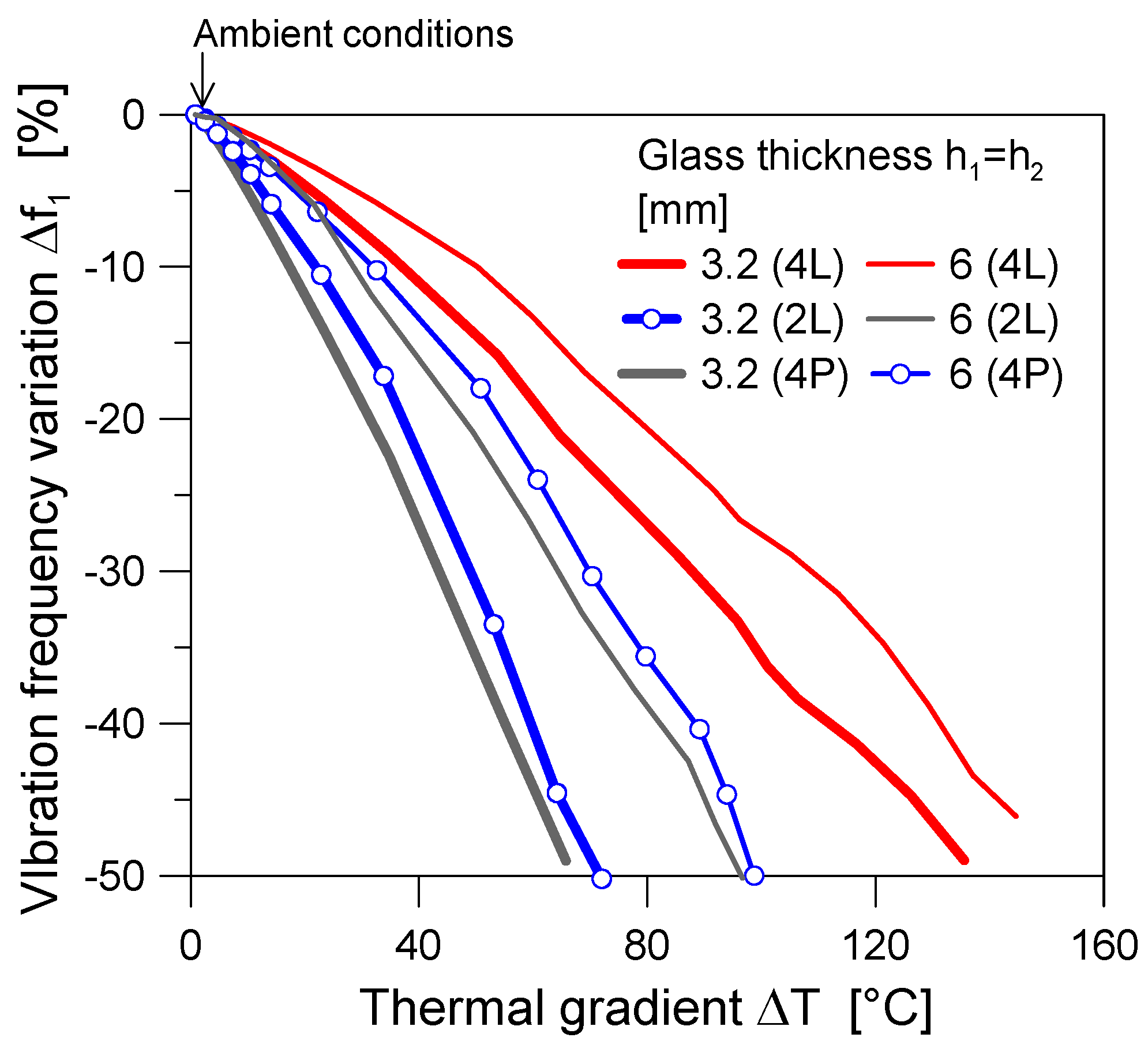 Compared to earlier evidence from the literature, the present numerical study includes the critical role of progressive heating, which is typical of many ordinary or accidental scenarios for BIPV systems. Typical numerical results can be found in Figure 15, where the fundamental frequency variation is calculated as follows: