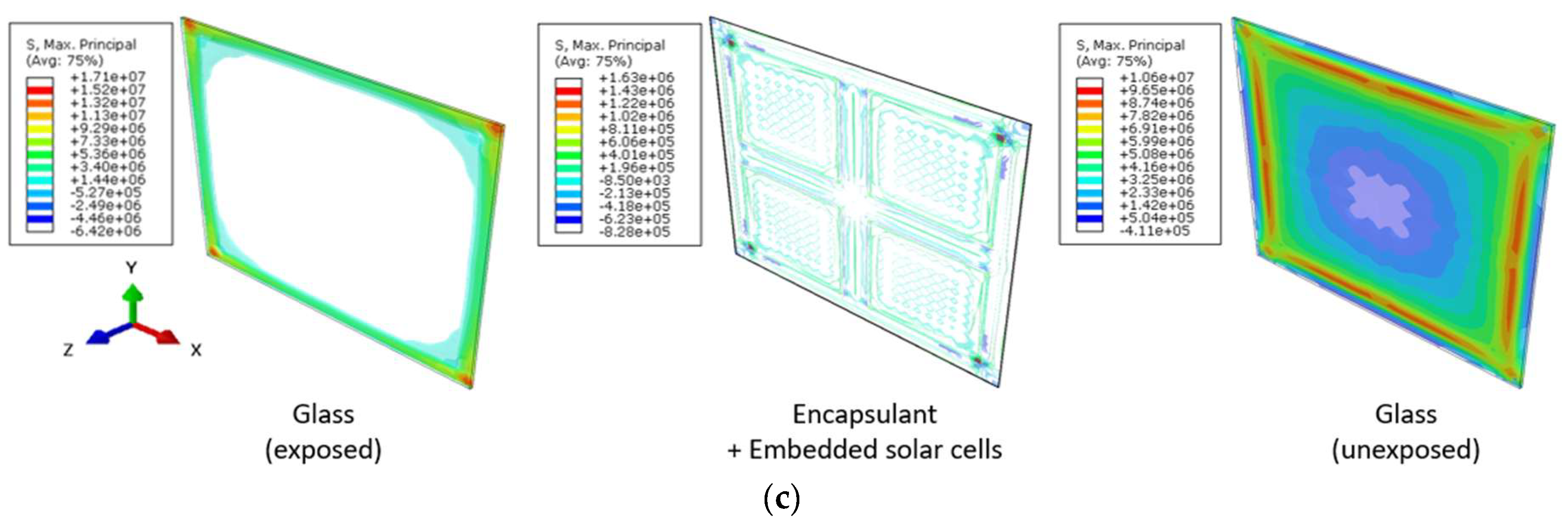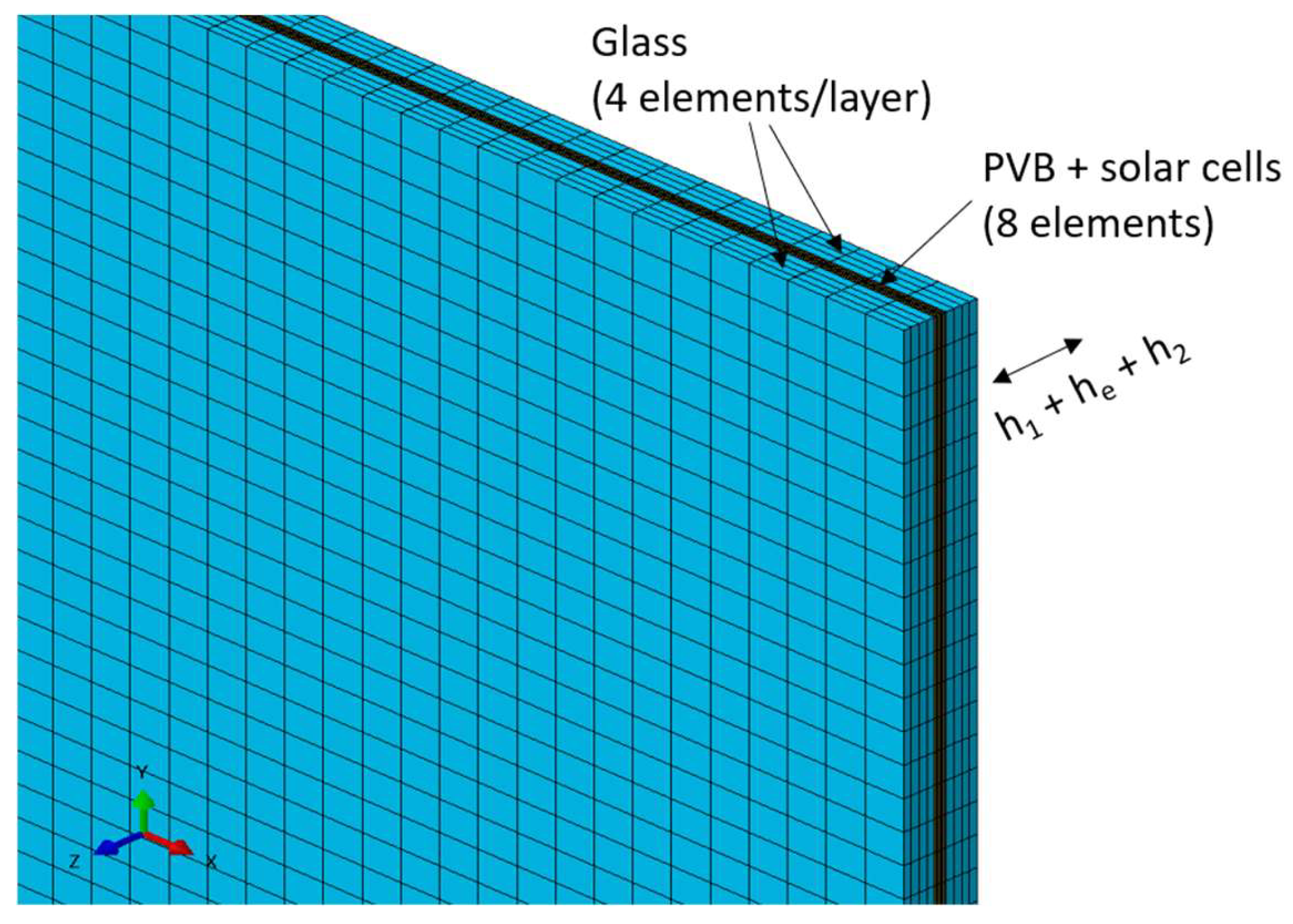 Over the years, the effects of varying temperatures on single-glass PV components have been explored by many research studies, based on different numerical strategies and approaches. For example, it was shown in [] that the use of FE computations represents an efficient support for possible design optimization and certification. Also, FE tools can be used to extend the typical testing configurations that are recommended by standards.